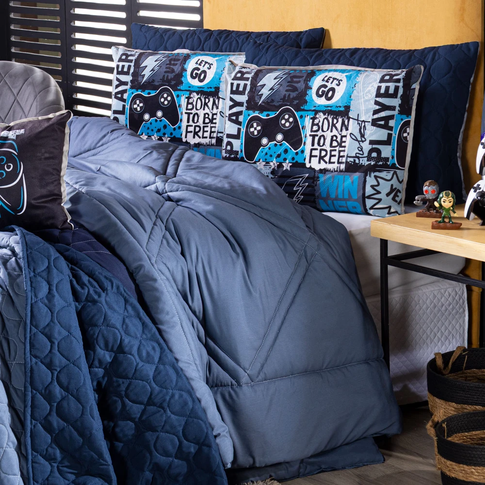 O Kit Edredom Best Player é a escolha ideal para quem ama o universo gamer e quer levar estilo e conforto para o quarto. Produzido em tecido Percal de 300 fios, possui toque acetinado e super macio, garantindo noites mais aconchegantes. O design é inspirado na cultura dos games, com estampas de controles, frases temáticas e elementos gamer que deixam o ambiente moderno e cheio de personalidade. O edredom é dupla face, com costura pantográfica computadorizada que forma desenhos em linha e um acabamento sofisticado. O kit é composto por 1 edredom dupla face, 2 porta-travesseiros com debrum, 2 porta-travesseiros estampados com viés, 1 capa de almofada quadrada estampada e 1 almofada cheia retangular estampada com viés, totalizando as 7 peças que unem beleza e conforto em um só conjunto. Confira!