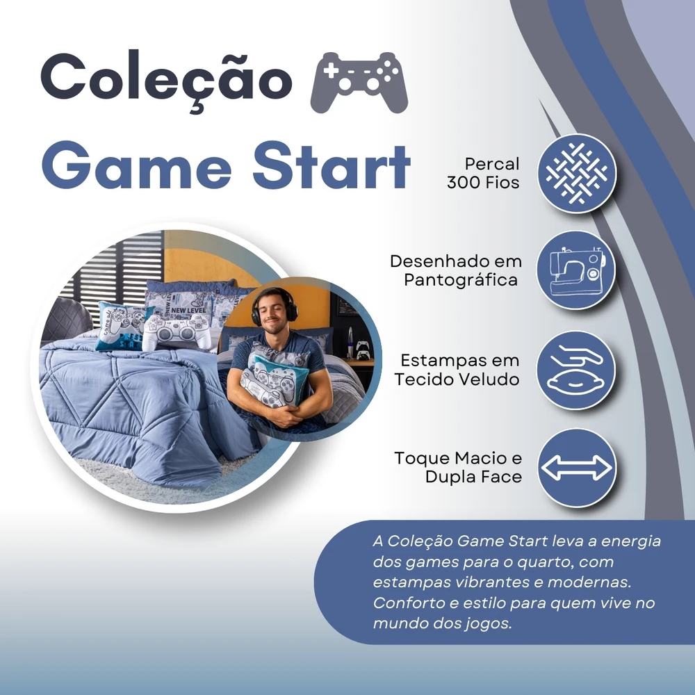 O Kit Edredom Game Start é perfeito para quem ama o universo gamer e quer levar esse estilo para a decoração do quarto. Confeccionado em Percal 300 Fios Dupla Face, o edredom oferece toque super macio e acabamento impecável. O kit acompanha fronhas, capa de almofada com tema de videogame e uma almofada divertida em formato de controle, tudo estampado em um tecido de veludo com um toque incrível, deixando o ambiente moderno e descontraído. Ideal para crianças, jovens e adultos que respiram o mundo dos games e valorizam conforto aliado a design exclusivo. Confira!