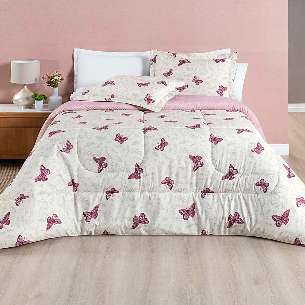 Kit Edredom Cobertor Celi Super King Dupla Face Micropercal Estampado 200 Fios 3 Peças Borboletas Rosê