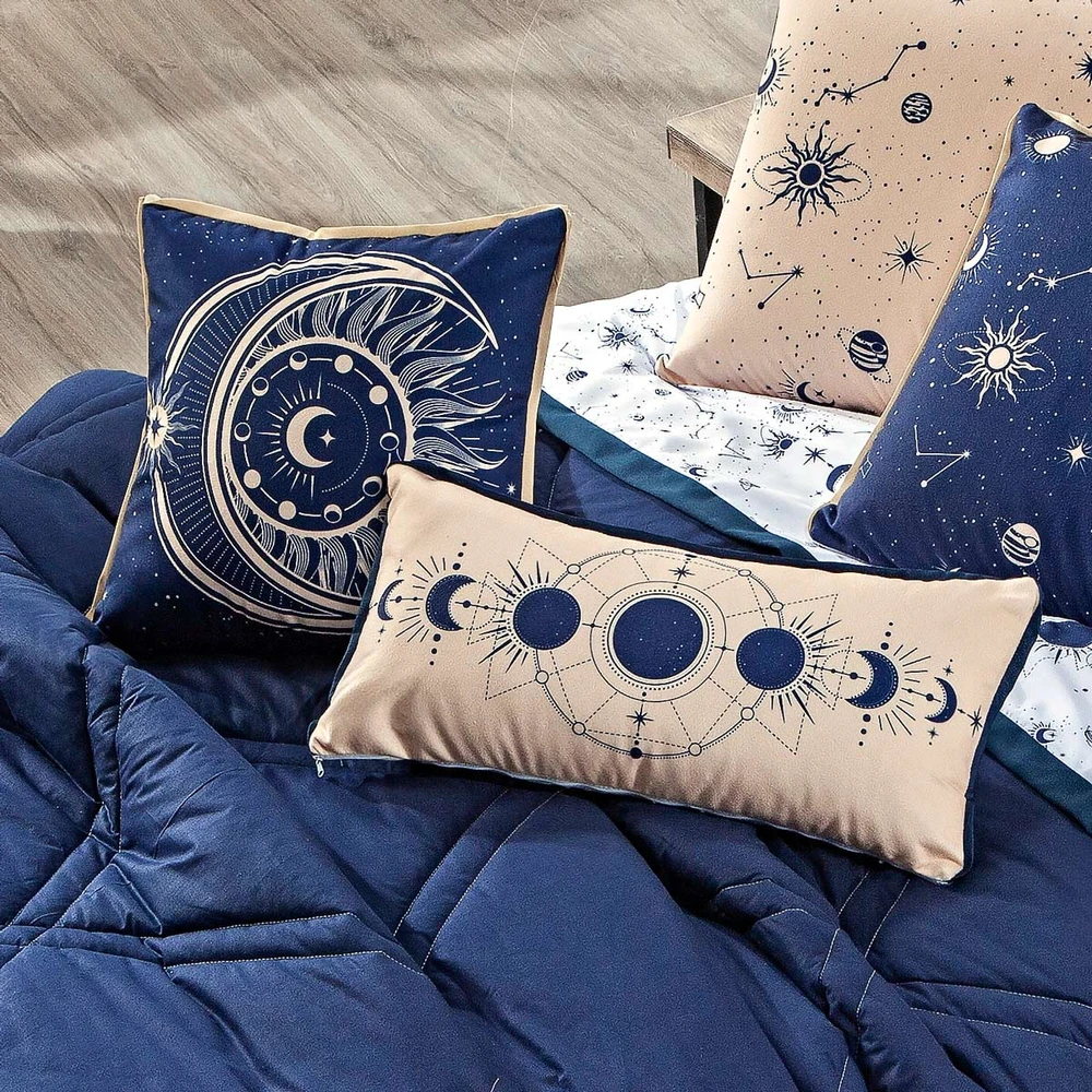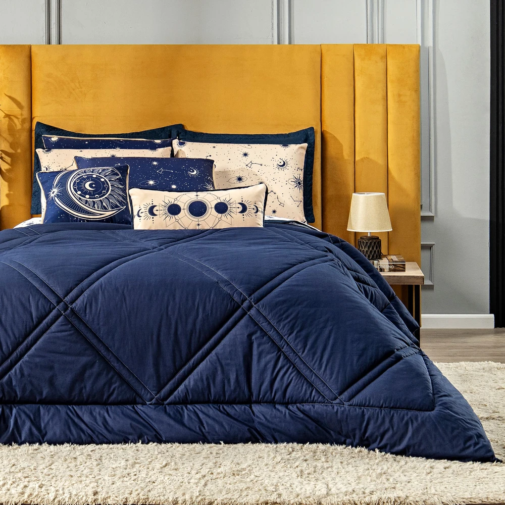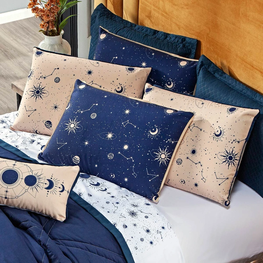 Transforme seu quarto em um verdadeiro santuário estelar e um refúgio celestial com nosso deslumbrante Kit Edredom Constelações! Composto por peças meticulosamente projetadas, este conjunto é a fusão perfeita entre estilo celestial e qualidade incomparável. Feito de percal 300 fios e 100% algodão original, cada peça deste kit é uma declaração de luxo e conforto. Experimente a suavidade do tecido contra a pele e mergulhe em uma sensação de bem-estar que só o algodão de alta qualidade pode proporcionar. O edredom, em sua dupla face, apresenta uma deslumbrante cor em um profundo azul marinho. As almofadas e fronhas coordenadas adicionam um toque de sofisticação extra, completando o visual do seu ambiente, estampas temáticas digitais em tecido veludo suede com um toque super macio. Ideal para uma noite de sono revigorante ou para relaxar durante o dia, este kit é a escolha perfeita para quem busca combinar estilo e conforto. Deixe-se envolver pelo encanto das estrelas, do universo da astrologia e dos signos e adicione um toque celestial à sua decoração. Não espere mais para transformar o seu espaço, garanta já o seu Kit e descubra o conforto e a elegância que só os melhores materiais podem oferecer. Confira!