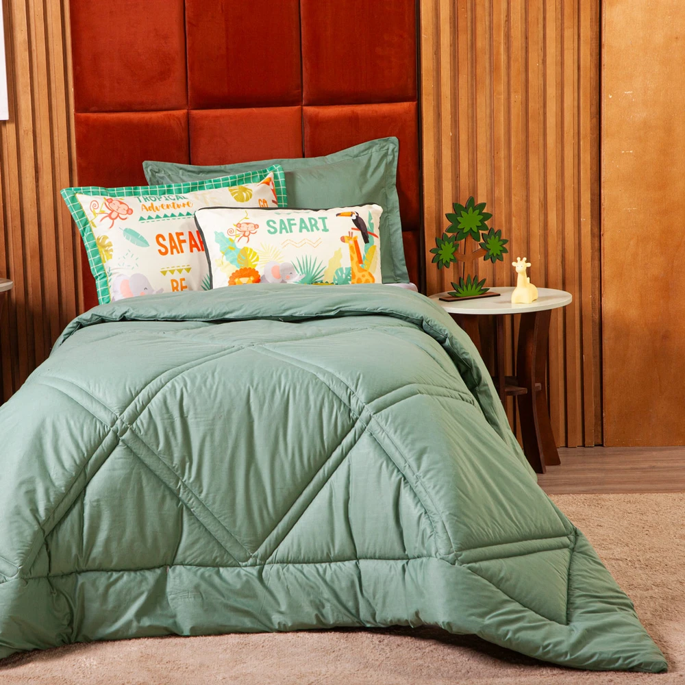 Leve um toque de aventura e aconchego para o quarto dos pequenos com o Kit Edredom Safari. Confeccionado em percal de 300 fios em 100% algodão, este conjunto de alta qualidade oferece uma sensação de suavidade e conforto, ideal para proporcionar noites de sono tranquilas e agradáveis. O edredom dupla face traz a versatilidade e praticidade para o dia a dia. O kit é acompanhado com uma almofada retangular e fronhas estampadas, que complementam o tema safari com um design alegre e colorido, juntamente com as fronhas lisas e o edredom volumoso que garantem ainda mais conforto. As peças estampadas em veludo trazem um detalhe único e divertido, com a estampa que remete à selva e aos animais que encantam as crianças.