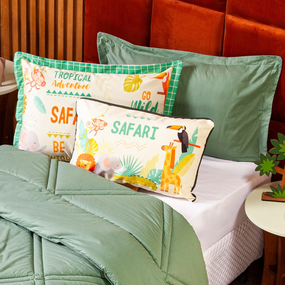 Leve um toque de aventura e aconchego para o quarto dos pequenos com o Kit Edredom Safari. Confeccionado em percal de 300 fios em 100% algodão, este conjunto de alta qualidade oferece uma sensação de suavidade e conforto, ideal para proporcionar noites de sono tranquilas e agradáveis. O edredom dupla face traz a versatilidade e praticidade para o dia a dia. O kit é acompanhado com uma almofada retangular e uma fronha estampada, que complementa o tema safari com um design alegre e colorido, juntamente com a fronha lisa e o edredom volumoso que garantem ainda mais conforto. As peças estampadas em veludo trazem um detalhe único e divertido, com a estampa que remete à selva e aos animais que encantam as crianças.