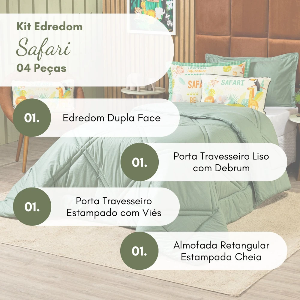Ideal para quartos infantis, o Kit Edredom Safari não só adiciona um toque de estilo com suas cores e estampas vibrantes, mas também oferece a qualidade e o conforto que seu filho merece. Este conjunto é perfeito para criar um ambiente acolhedor, divertido e moderno, onde as crianças podem descansar e se divertir. Confira!
