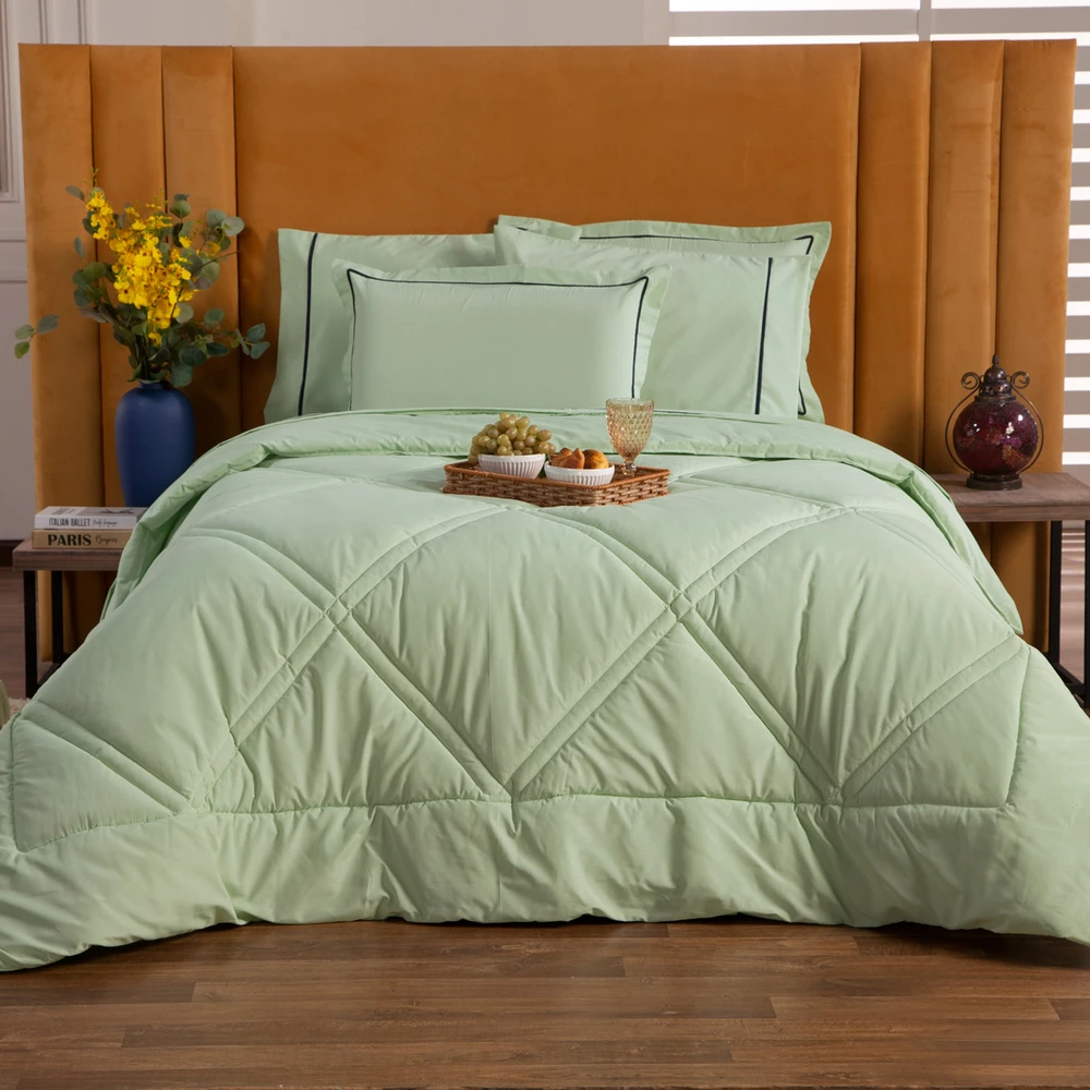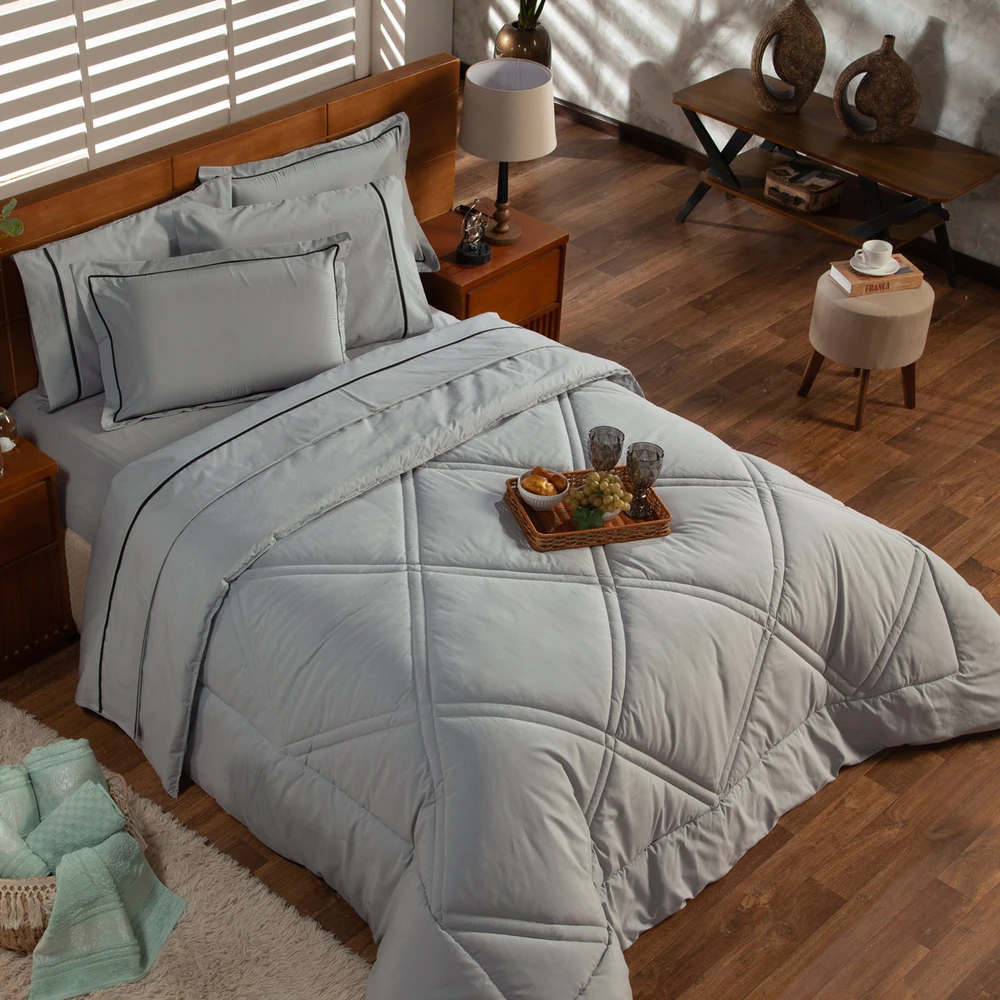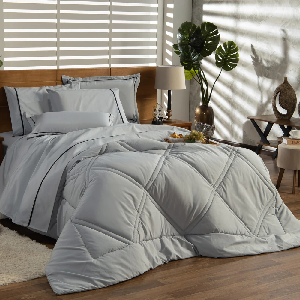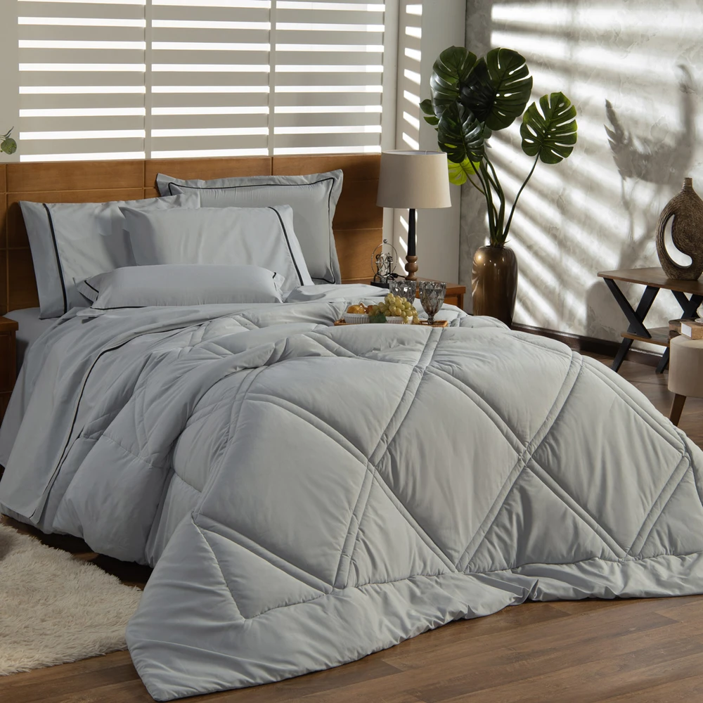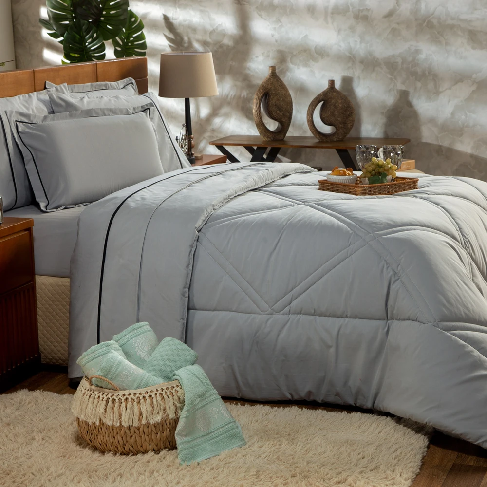 A nova coleção Milano traz toda a sofisticação e aconchego. Por possuírem dupla face, apresentam superfície que valoriza ainda mais as cores, confeccionado em pantográfica computadorizada com lindos desenhos geométricos no edredom! Composto em tecido Percal 200 Fios 80% algodão super macio com 200g de enchimento, agregando ainda mais para seu conforto! Acompanhando também dois porta-travesseiros com detalhes no acabamento em Viés super moderno! Ideal para decorar, trazer conforto e tornar o quarto ainda mais convidativo e elegante! Confira!