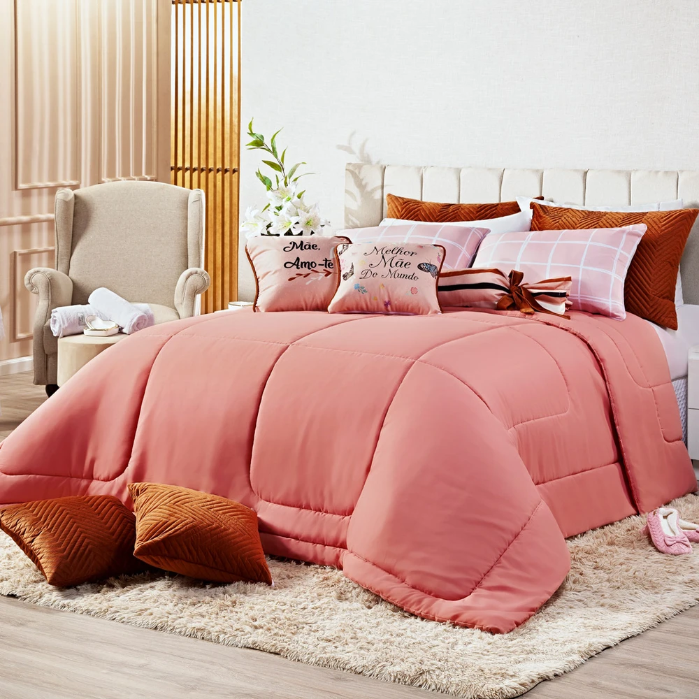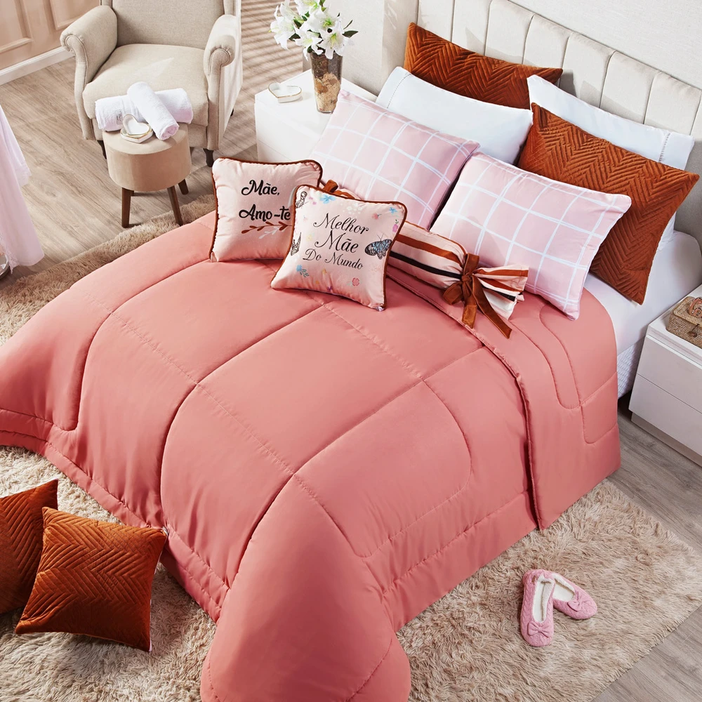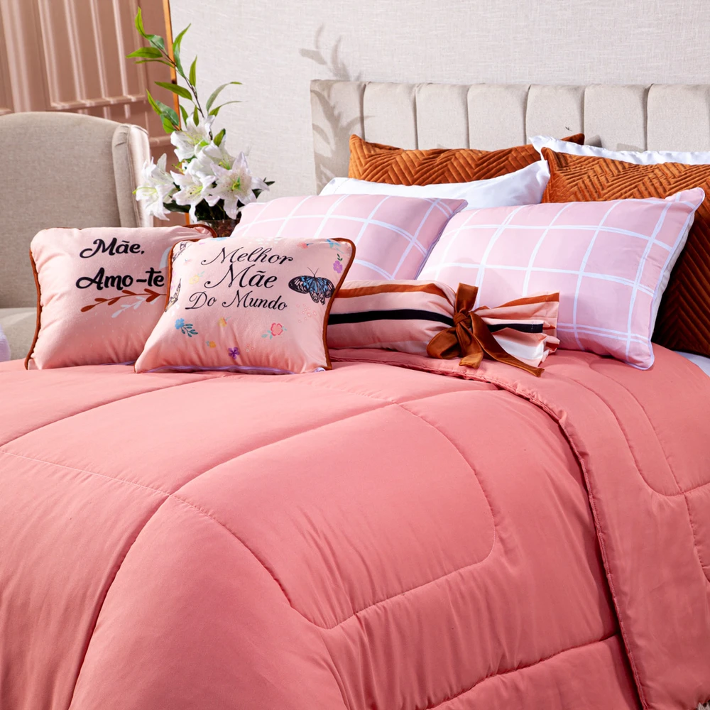Nova Coleção Mamma Amore, o Kit completo coordenando cores e lindas estampas que foram desenvolvidas especialmente para deixar o quarto ainda mais elegante. Dupla face você terá dois edredons em um só, podendo utilizar os dois lados! Esses edredons são fabricados em tecido Percal 200 fios de altíssima qualidade, perfeito para uma boa noite de sono, trazendo mais resistência, conforto e praticidade na hora de lavar. Além do belíssimo Edredom, o Kit acompanha um par de porta-travesseiros, rolinho com laço e almofadas temáticas estampadas especialmente para quem você ama! Sendo o rolinho e almofadinhas confeccionadas em tecido suede com toque de veludo macio e aconchegante, tudo feito com muito amor e carinho para você presentear sua Mãe como ela merece! Confira!