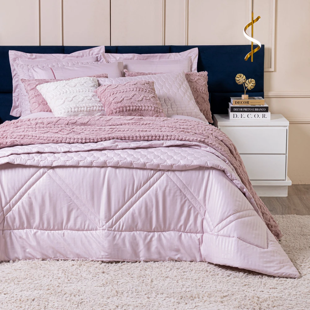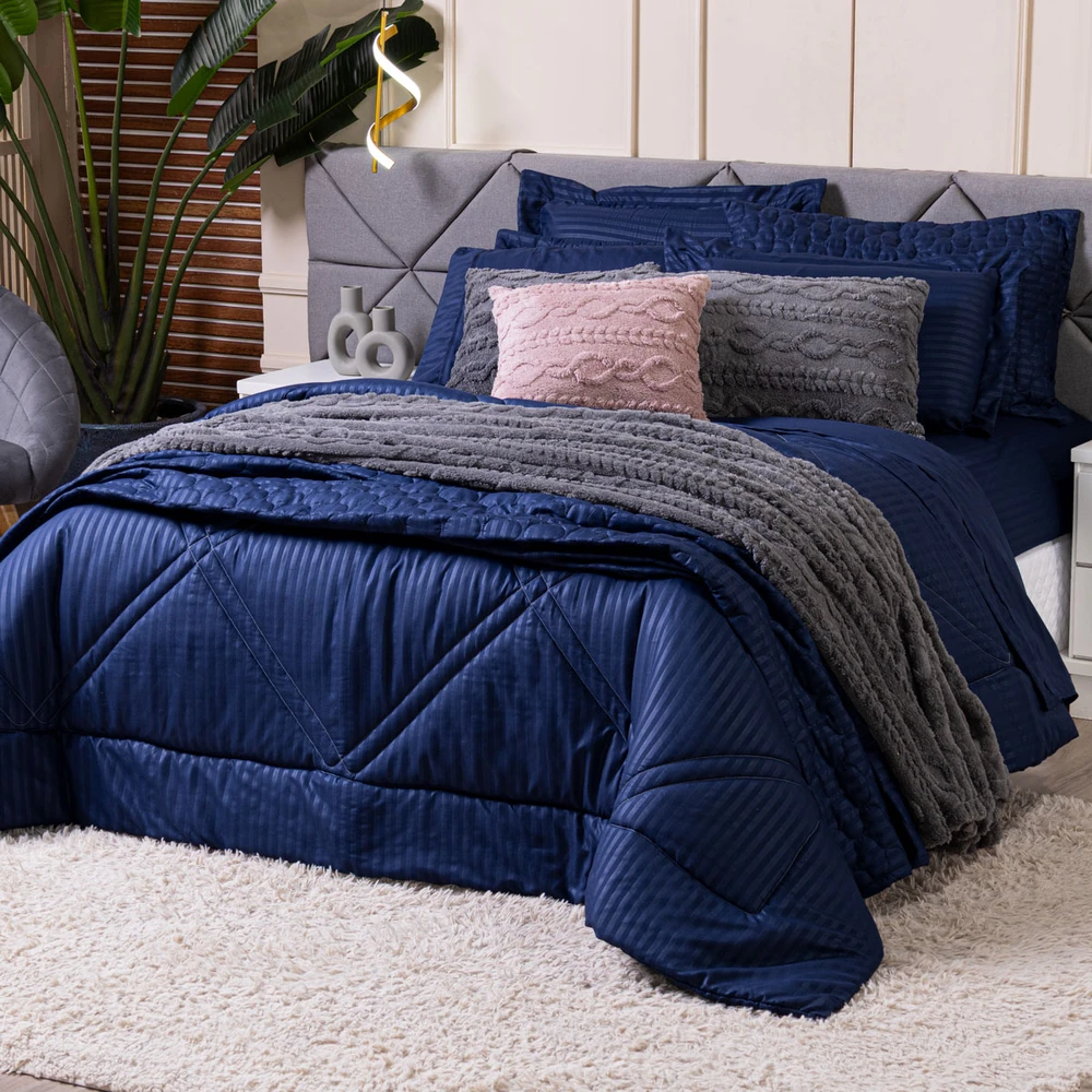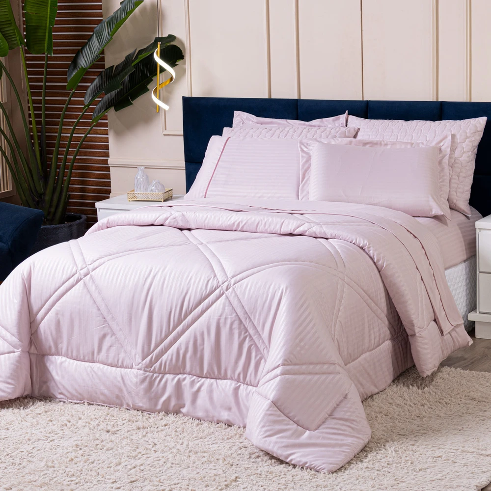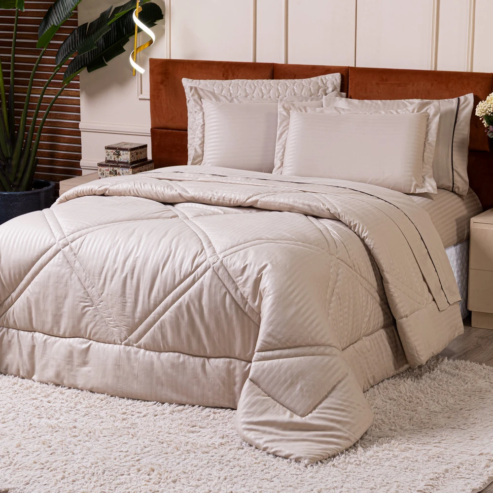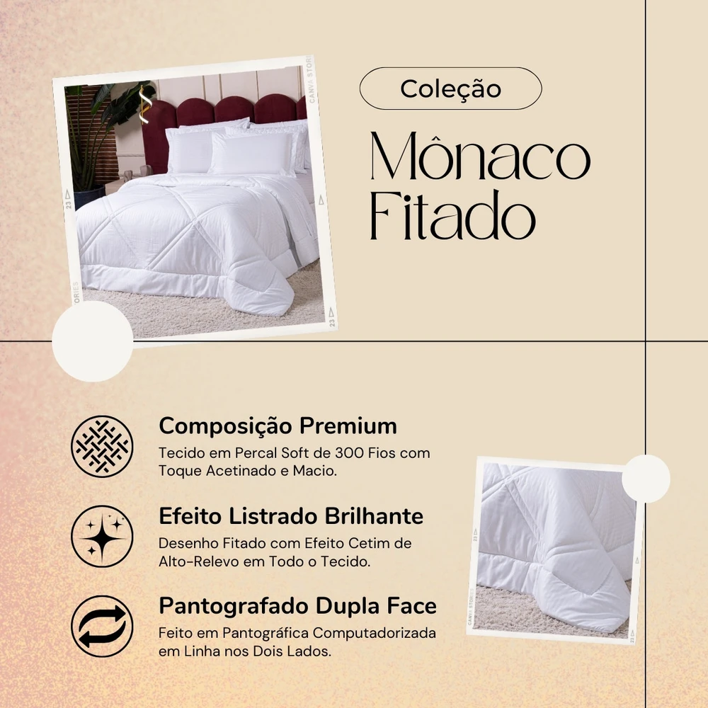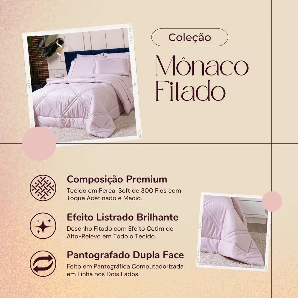 O Kit Edredom Mônaco em Tecido Fitado Percal 300 Fios é a escolha perfeita para quem busca conforto, sofisticação e praticidade. Composto por três peças, sendo um edredom e duas fronhas, este kit proporciona um toque acetinado, garantindo uma sensação suave e agradável. A textura do percal soft em 300 fios combina resistência e maciez, proporcionando noites de sono de qualidade. O design dupla face em desenho listrado oferece versatilidade para compor diferentes estilos de decoração, com linhas em alto relevo brilhante, adaptando-se facilmente aos diversos ambientes. A escolha do tecido fitado confere um acabamento impecável, enquanto as listras discretas no tecido dão um toque de elegância e modernidade. Perfeito para transformar o visual do seu quarto, o Kit Edredom Mônaco oferece não apenas beleza, mas também funcionalidade e durabilidade, sendo ideal para quem aprecia o conforto de um bom descanso. Confira!