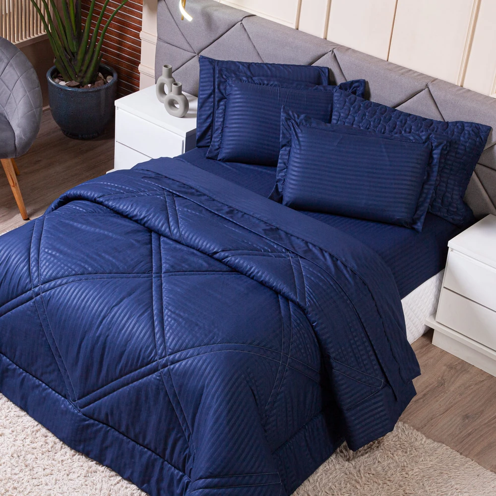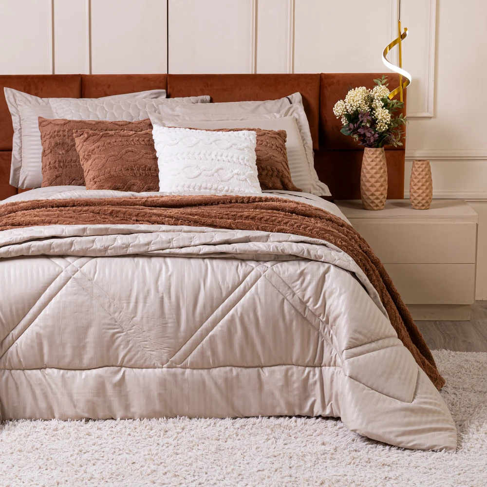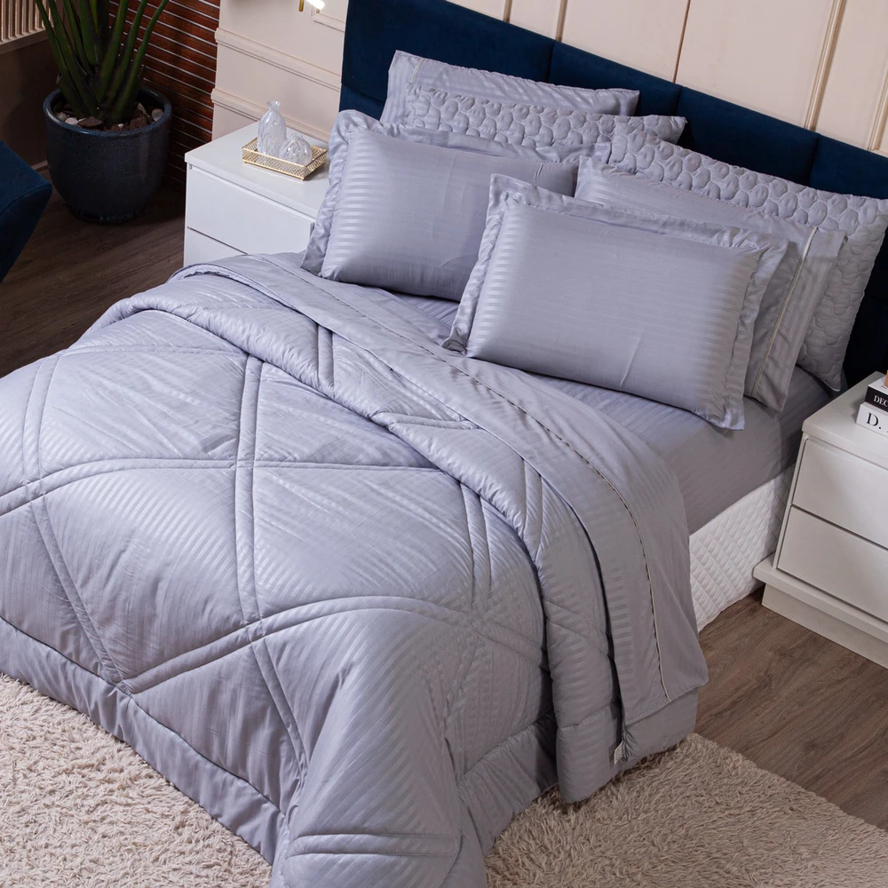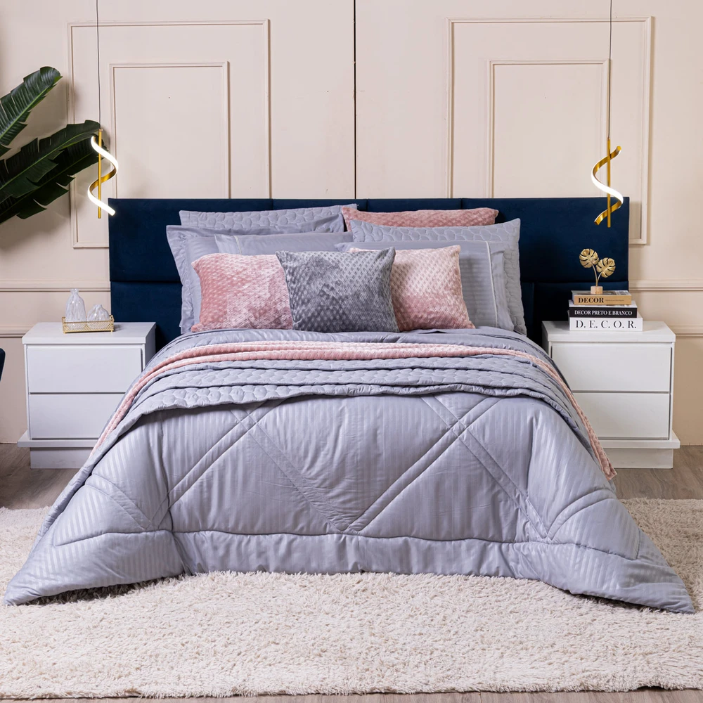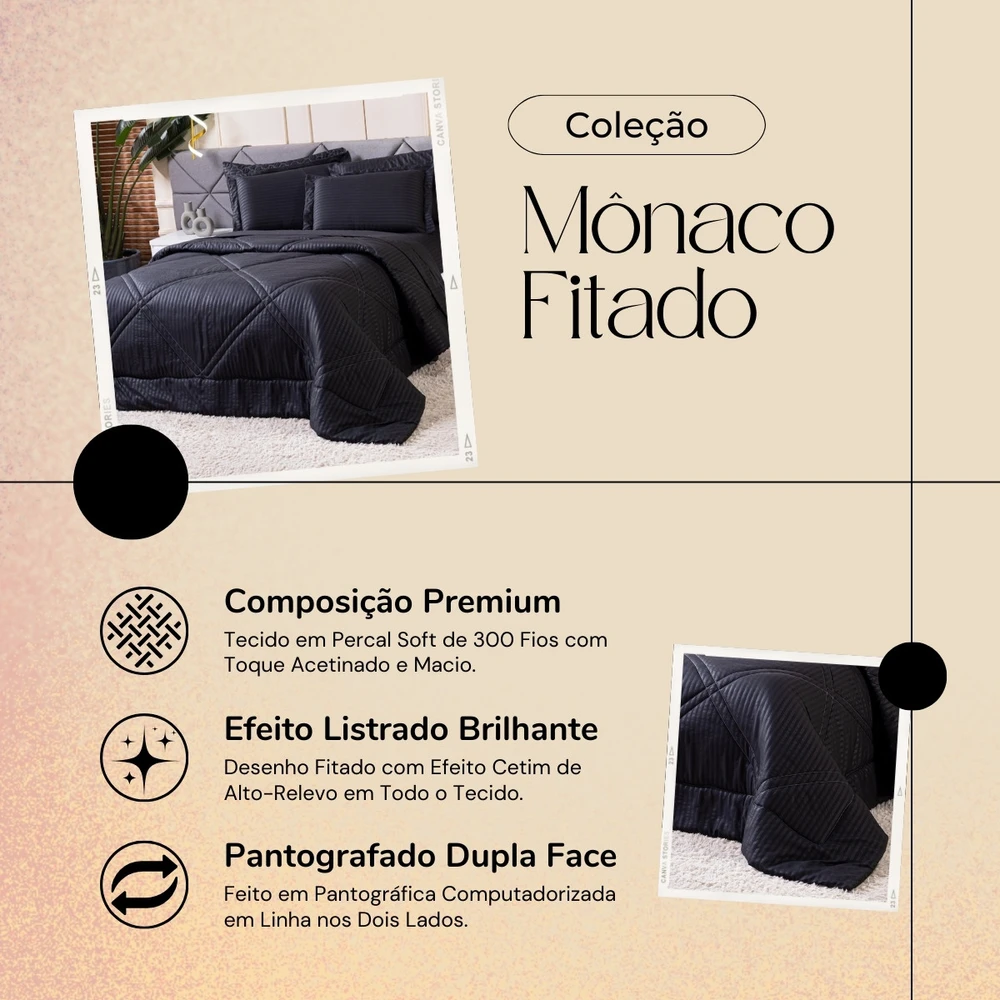 O Kit Edredom Mônaco em Tecido Fitado Percal 300 Fios é a escolha perfeita para quem busca conforto, sofisticação e praticidade. Composto por três peças, sendo um edredom e duas fronhas, este kit proporciona um toque acetinado, garantindo uma sensação suave e agradável. A textura do percal soft em 300 fios combina resistência e maciez, proporcionando noites de sono de qualidade. O design dupla face em desenho listrado oferece versatilidade para compor diferentes estilos de decoração, com linhas em alto relevo brilhante, adaptando-se facilmente aos diversos ambientes. A escolha do tecido fitado confere um acabamento impecável, enquanto as listras discretas no tecido dão um toque de elegância e modernidade. Perfeito para transformar o visual do seu quarto, o Kit Edredom Mônaco oferece não apenas beleza, mas também funcionalidade e durabilidade, sendo ideal para quem aprecia o conforto de um bom descanso. Confira!