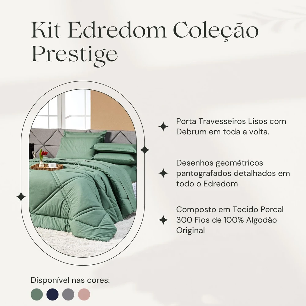Apresentamos o espetacular Kit Edredom Prestige, a essência do luxo e do conforto para o seu refúgio pessoal! Este kit não é apenas uma adição à sua cama; é uma declaração de estilo e qualidade incomparável. Confeccionado com tecido liso percal de 300 fios, cada toque é uma experiência de suavidade e requinte, proporcionando noites de sono verdadeiramente revigorantes. Fabricado com 100% algodão, este conjunto garante não apenas conforto supremo, mas também durabilidade excepcional. A praticidade do design dupla face permite que você utilize qualquer um dos dois lados do edredom, adaptando-se perfeitamente ao seu dia-a-dia. Com duas fronhas coordenadas, o conjunto cria uma estética coesa e elegante, elevando instantaneamente o visual do seu espaço. Mime-se com o conforto indulgente e a qualidade inigualável do Kit Edredom Prestige. Criado para aqueles que valorizam não apenas o sono reparador, mas também o estilo e o requinte em cada detalhe. Não apenas um produto, mas um investimento em seu bem-estar e na estética do seu lar. Experimente o luxo definitivo e transforme suas noites em uma experiência de puro deleite. Adquira agora e mergulhe na indulgência de um sono verdadeiramente celestial! Confira!
