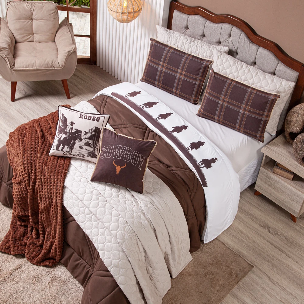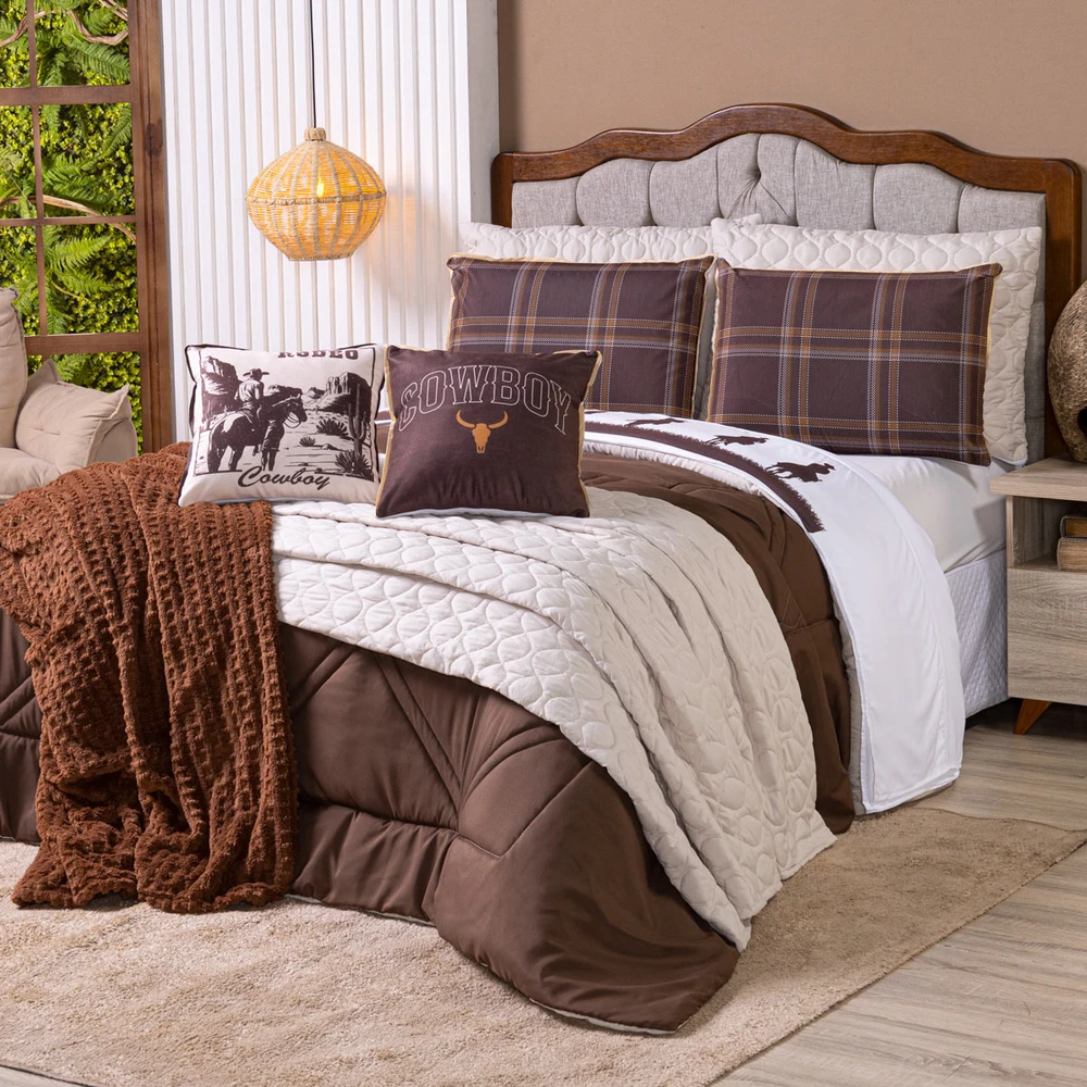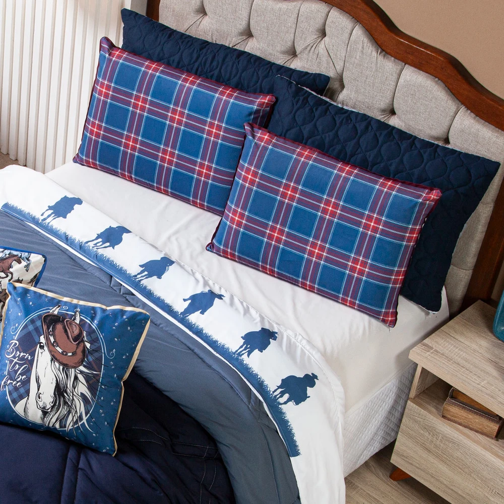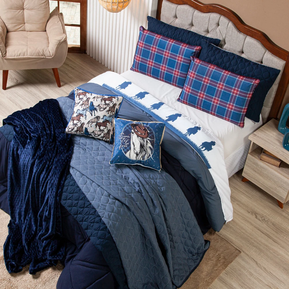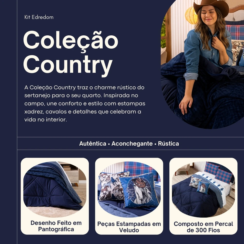 O Kit Edredom Country transforma o quarto em um ambiente acolhedor e cheio de personalidade. Produzido em Percal 300 fios dupla face, o edredom oferece maciez, conforto e alta durabilidade. O conjunto acompanha fronhas e capas de almofadas em veludo estampado, trazendo o charme do estilo country com elementos como xadrez, cavalos e referências do campo. Ideal para quem busca aconchego aliado a um visual rústico e elegante, é a escolha perfeita para compor uma decoração autêntica e sofisticada. Confira!