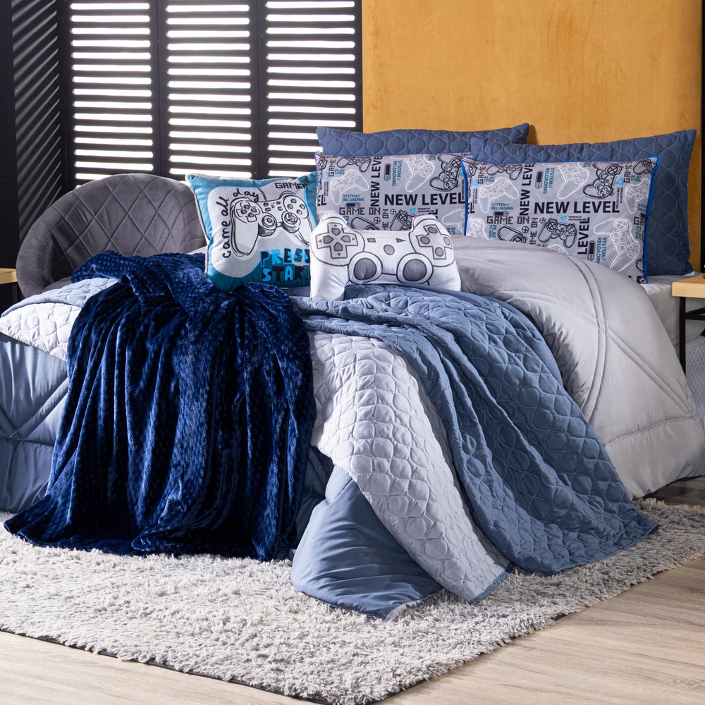 O Kit Edredom Game Start é perfeito para quem ama o universo gamer e quer levar esse estilo para a decoração do quarto. Confeccionado em Percal 300 Fios Dupla Face, o edredom oferece toque super macio e acabamento impecável. O kit acompanha fronhas, capa de almofada com tema de videogame e uma almofada divertida em formato de controle, tudo estampado em um tecido de veludo com um toque incrível, deixando o ambiente moderno e descontraído. Ideal para crianças, jovens e adultos que respiram o mundo dos games e valorizam conforto aliado a design exclusivo. Confira!
