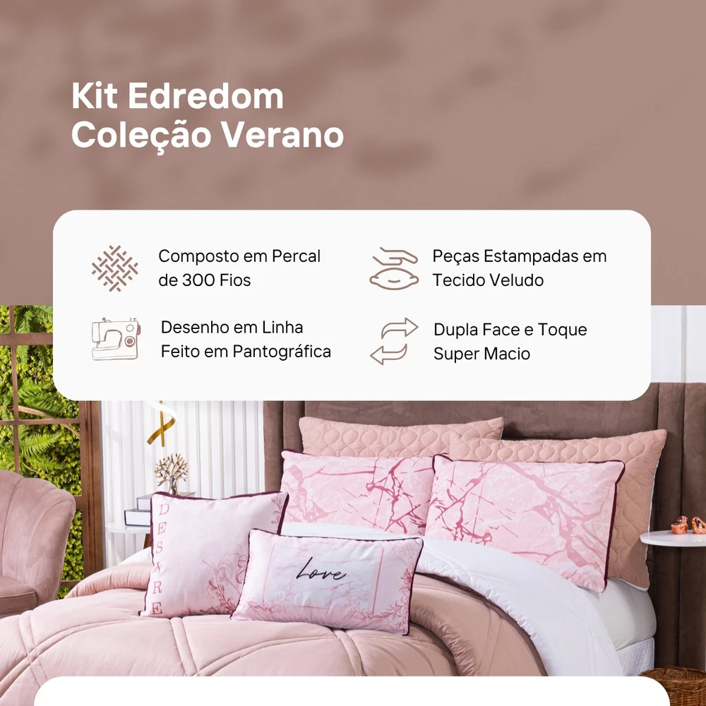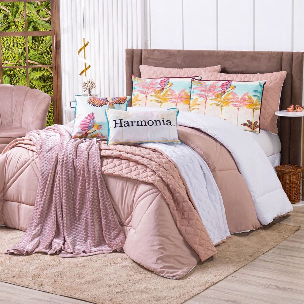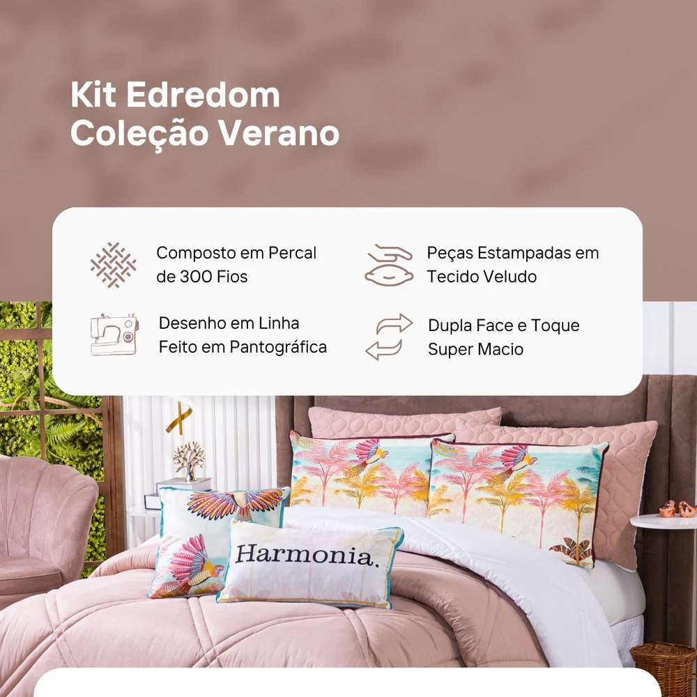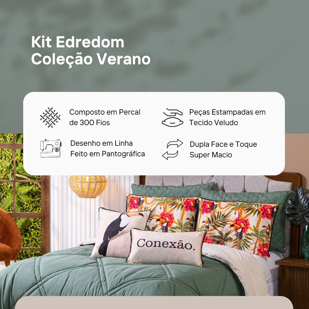 O Kit Verano é a escolha ideal para quem deseja transformar o quarto em um espaço cheio de vida e aconchego. Inspirado na beleza da natureza, ele traz estampas vibrantes que remetem à floresta, com animais, flores e plantas em cores intensas que deixam o ambiente mais alegre e acolhedor. Produzido em percal poliéster de 300 fios, o tecido oferece um toque super macio e agradável, enquanto o enchimento alto e volumoso garante noites de sono mais confortáveis. O edredom é dupla face e conta com acabamento pantográfico computadorizado, que valoriza ainda mais o design e confere um detalhe sofisticado à peça. Para completar, o kit acompanha fronhas lisas e estampadas, além de almofadas temáticas que dão um charme e trazem uma mensagem especial à decoração, criando um conjunto prático, elegante e cheio de estilo para o dia a dia.