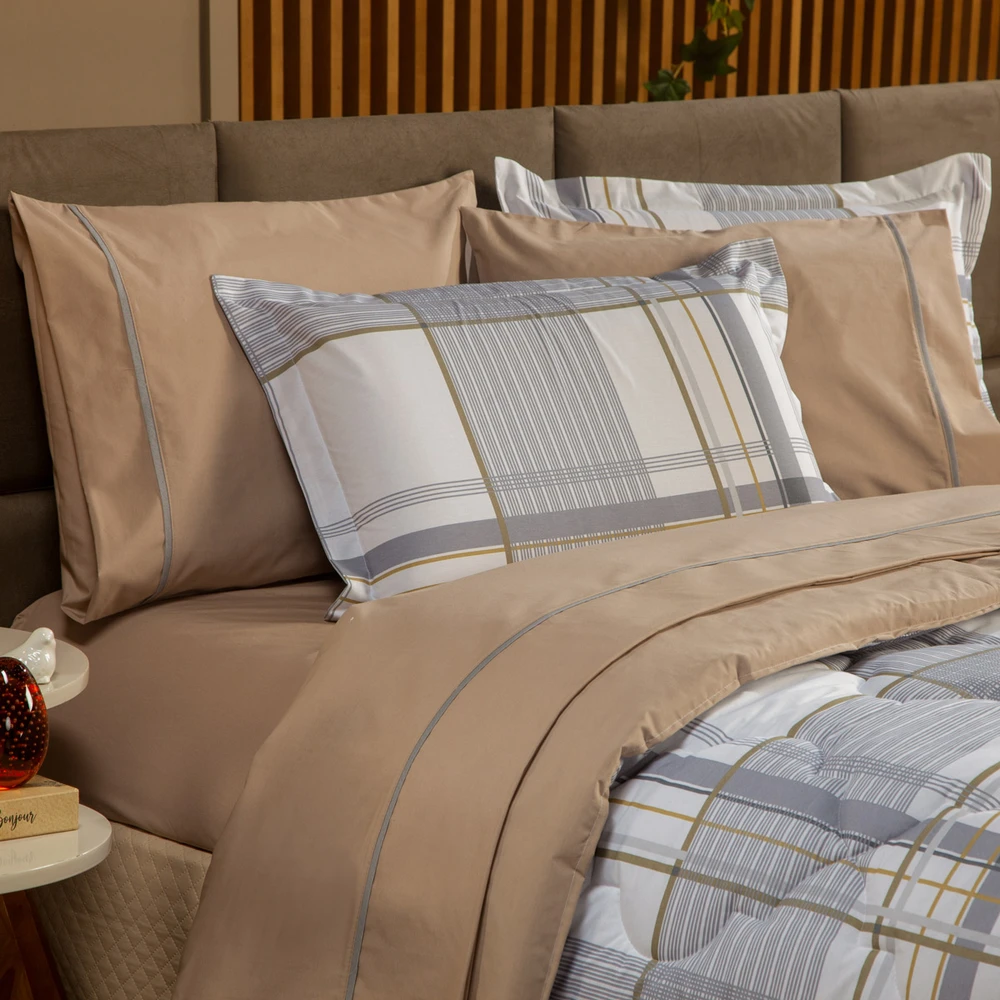 A nova coleção Ravena na cor Caqui traz toda a sofisticação e aconchego. Por possuírem dupla face, apresentam superfície que valoriza ainda mais as cores, confeccionado em pantográfica computadorizada com lindos desenhos geométricos no edredom! Composto em tecido estampado Percal 200 Fios 80% algodão super macio com 200g de enchimento, agregando ainda mais para seu conforto! Acompanhando também dois porta-travesseiros com detalhes no acabamento em Viés super moderno! Ideal para decorar, trazer conforto e tornar o quarto ainda mais convidativo e elegante! Confira!
