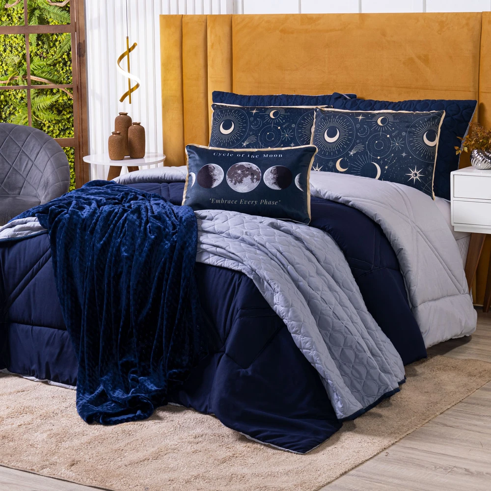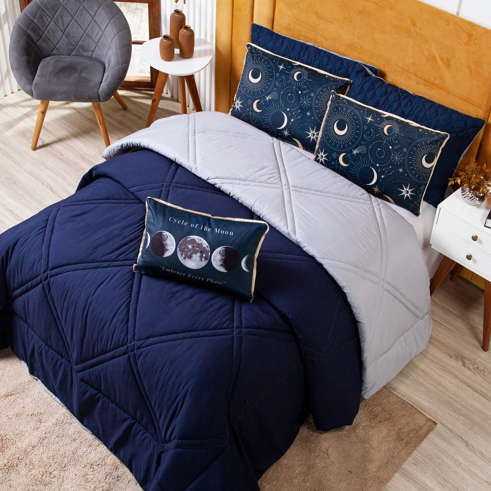 Transforme seu quarto em um verdadeiro universo de conforto e estilo com o Kit Edredom Astros. Confeccionado em Percal de 300 fios, possui toque acetinado, super macio e aconchegante, garantindo noites de sono mais tranquilas. O kit é totalmente temático, trazendo estampas inspiradas em luas, fases da lua, astros e elementos de astronomia, perfeito para quem ama o encanto do espaço sideral. O edredom dupla face conta com costura desenhada em linha feita em máquina pantográfica computadorizada, que adiciona elegância e sofisticação ao acabamento. Já os porta-travesseiros possuem detalhes em debrum e viés, reforçando a delicadeza do conjunto. A almofada retangular estampada complementa a composição, trazendo um charme extra para a decoração. Confira!