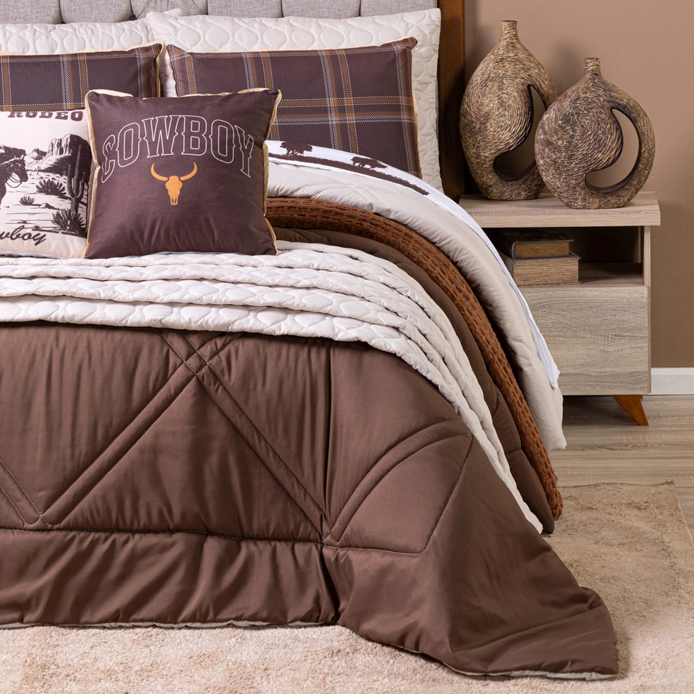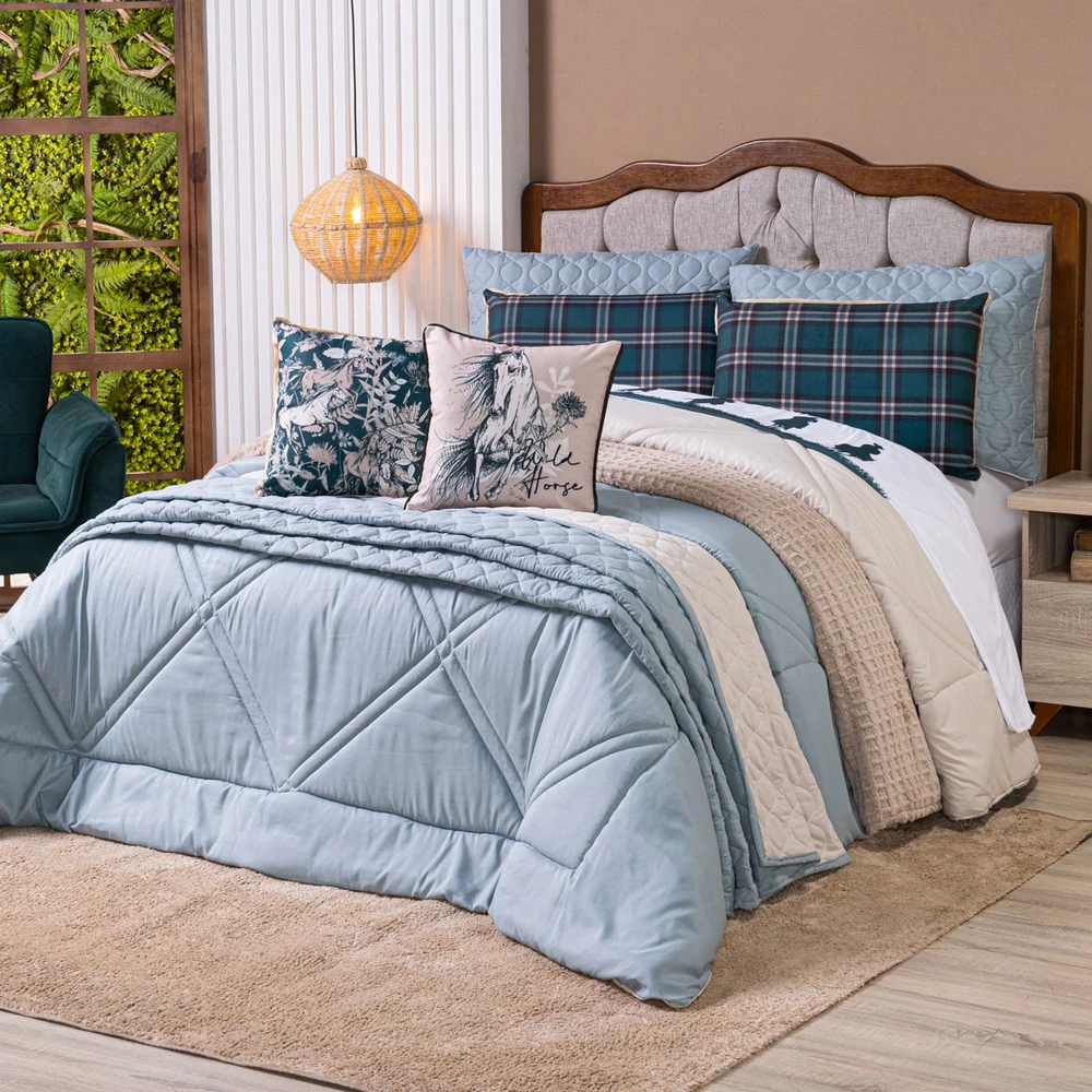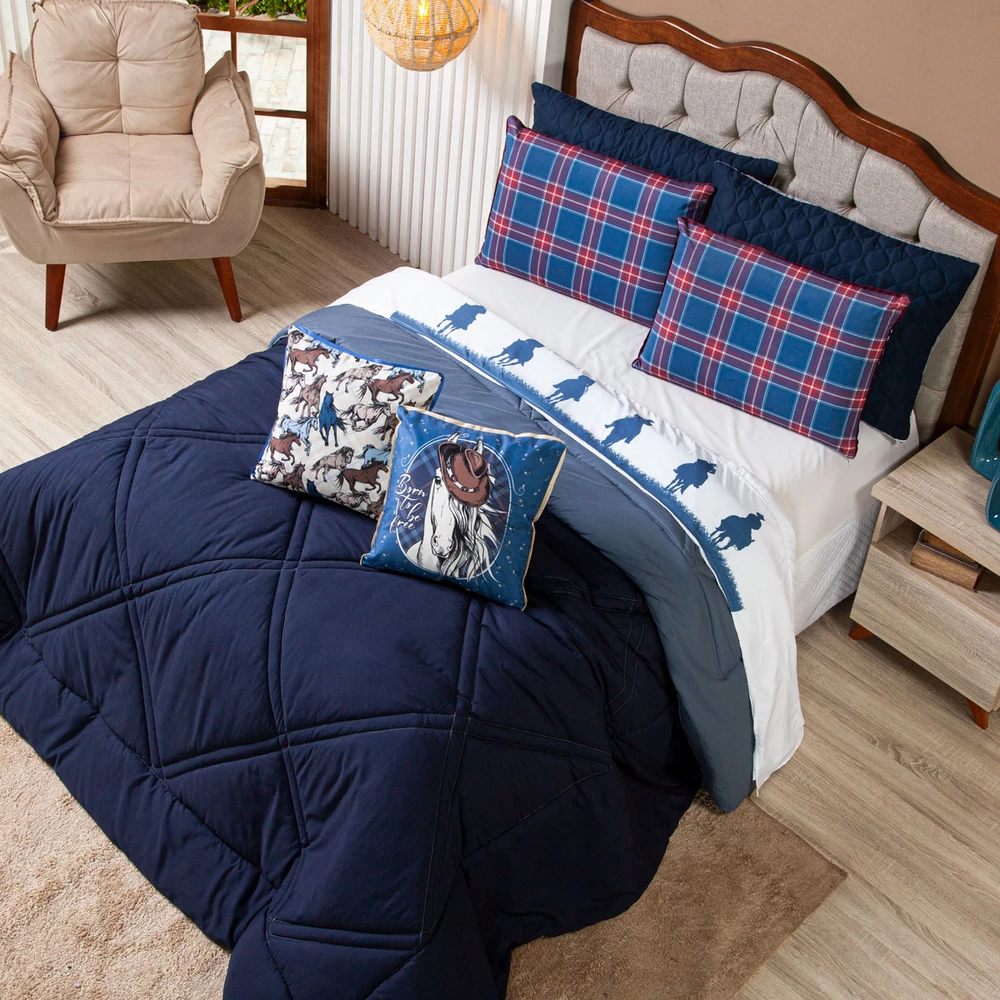 O Kit Edredom Country transforma o quarto em um ambiente acolhedor e cheio de personalidade. Produzido em Percal 300 fios dupla face, o edredom oferece maciez, conforto e alta durabilidade. O conjunto acompanha fronha e capas de almofadas em veludo estampado, trazendo o charme do estilo country com elementos como xadrez, cavalos e referências do campo. Ideal para quem busca aconchego aliado a um visual rústico e elegante, é a escolha perfeita para compor uma decoração autêntica e sofisticada. Confira!