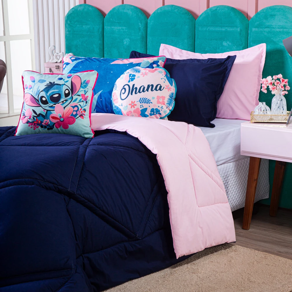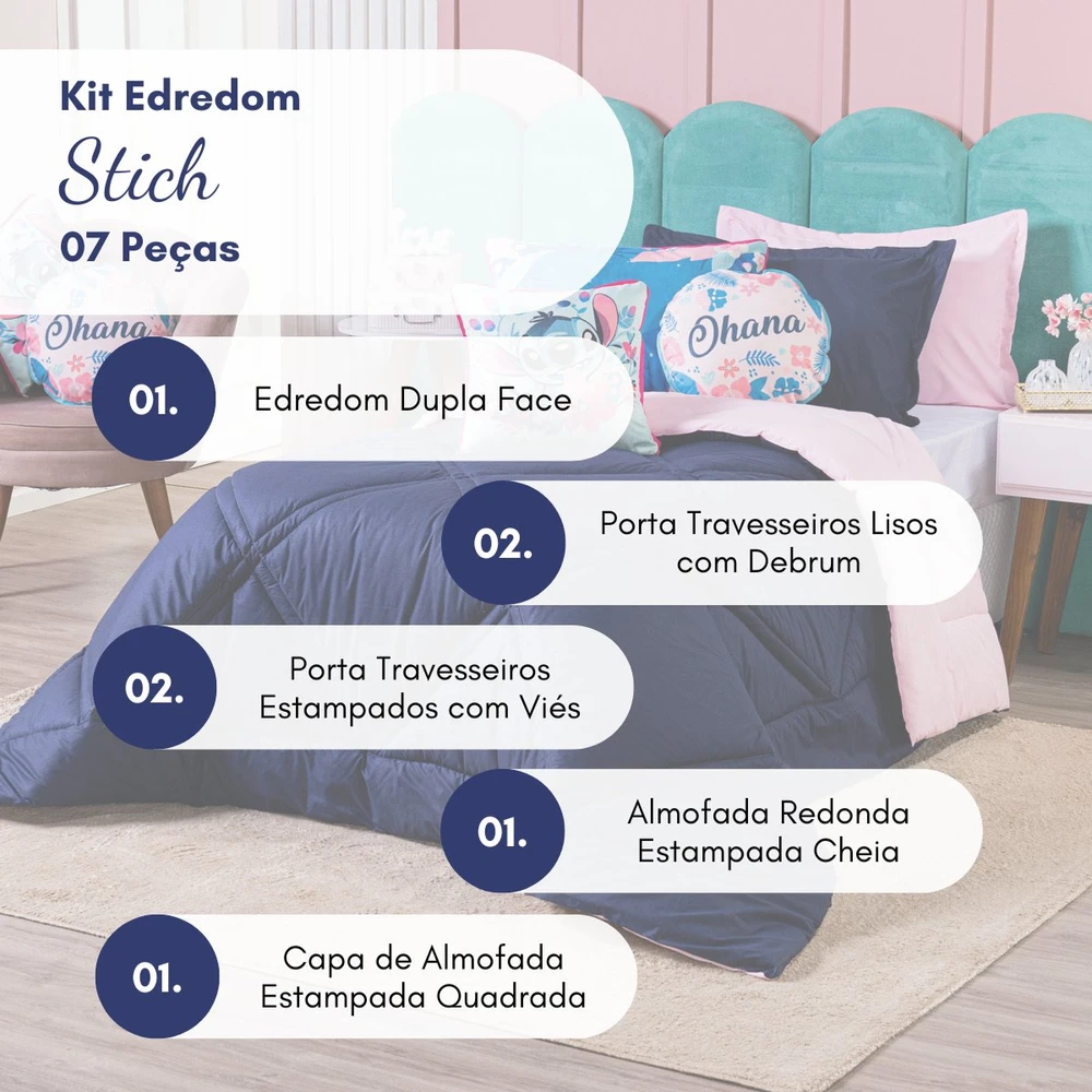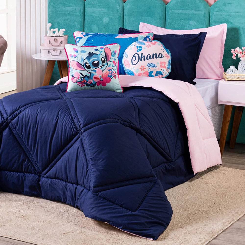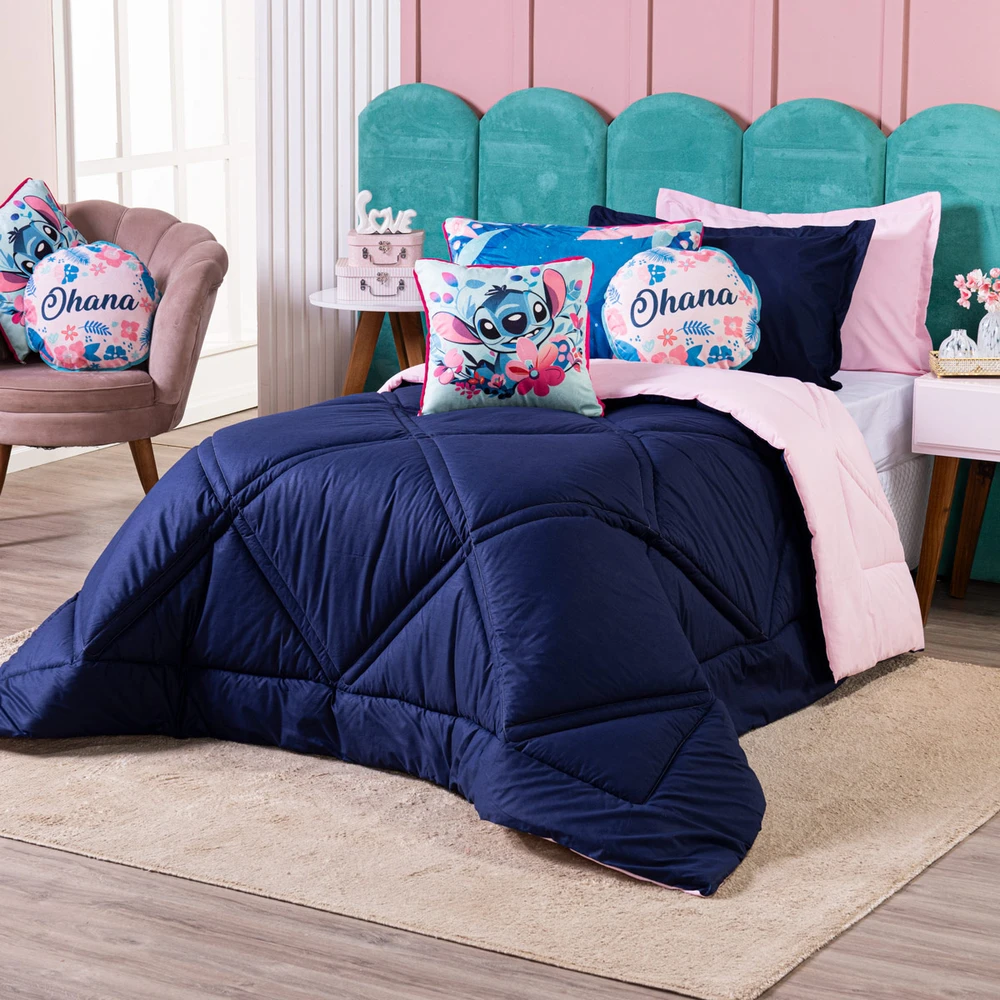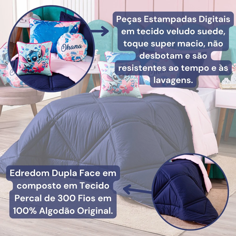 O Kit Edredom Stich é a escolha perfeita para transformar o quarto em um ambiente acolhedor e cheio de estilo. Com sete peças, este conjunto inclui um edredom de dupla face em Percal 300 fios, confeccionado com 100% algodão de alta qualidade, que proporciona um toque suave e confortável, além da versatilidade de poder usar tanto o lado Azul Marinho, quanto o lado Rosa. O design exclusivo com estampas vibrantes do personagem clássico do filme traz um charme divertido e delicado, ideal para quem busca um toque de personalidade e cor no ambiente. Acompanhando fronhas e almofadas estampadas decorativas que complementam o conjunto, todas confeccionadas em tecido Veludo com um toque super macio e sofisticado, garantindo um acabamento elegante e cheio de vida. Perfeito para camas queen, este kit une conforto, estilo e a qualidade de um produto original para dar um toque único ao quarto. Confira!