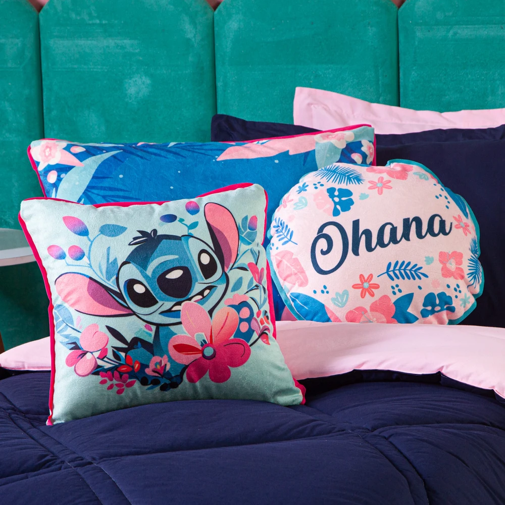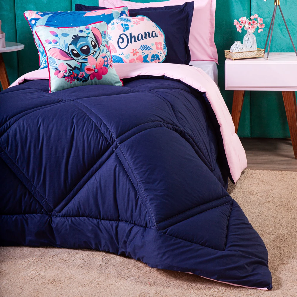 O Kit Edredom Stich é a escolha perfeita para transformar o quarto em um ambiente acolhedor e cheio de estilo. Com cinco peças, este conjunto inclui um edredom de dupla face em Percal 300 fios, confeccionado com 100% algodão de alta qualidade, que proporciona um toque suave e confortável, além da versatilidade de poder usar tanto o lado Azul Marinho, quanto o lado Rosa. O design exclusivo com estampas vibrantes do personagem clássico do filme traz um charme divertido e delicado, ideal para quem busca um toque de personalidade e cor no ambiente. Acompanhando fronha e almofadas estampadas decorativas que complementam o conjunto, todas confeccionadas em tecido Veludo com um toque super macio e sofisticado, garantindo um acabamento elegante e cheio de vida. Perfeito para camas de solteiro, este kit une conforto, estilo e a qualidade de um produto original para dar um toque único ao quarto. Confira!