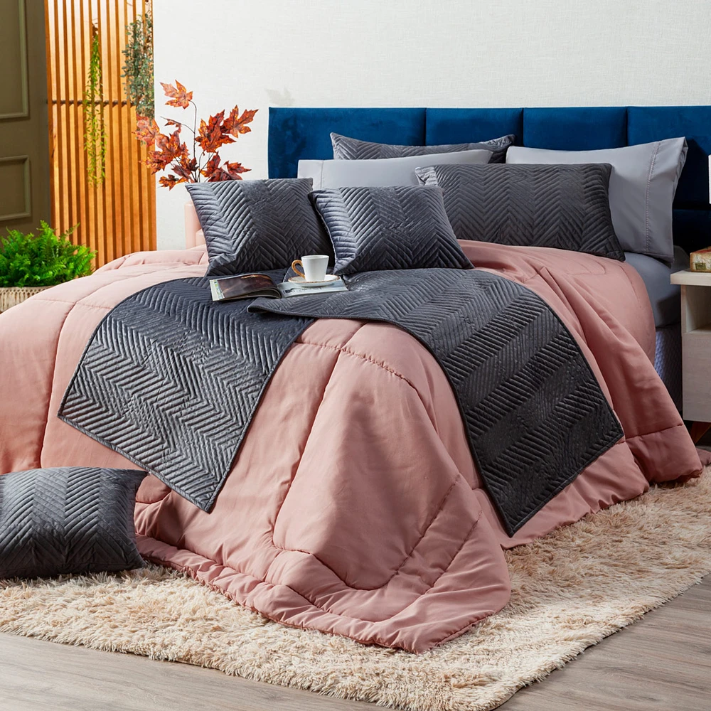 Nova Coleção Tóquio, o Kit perfeito, coordenando cores e estampas que foram desenvolvidas especialmente para deixar o quarto ainda mais elegante. Dupla face você terá dois edredons em um só, podendo utilizar os dois lados! Esses edredons são fabricados em tecido Percal 200 Fios 100% Poliéster de altíssima qualidade, perfeito para uma boa noite de sono, trazendo mais resistência, conforto e praticidade na hora de lavar. Além do belíssimo Edredom, o Kit acompanha um par de porta-travesseiros em veludo estampado com um toque maravilhoso, combinando tudo para sua decoração e também para presentear quem você ama! Confira!
