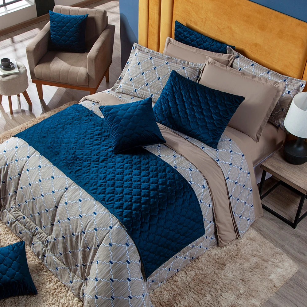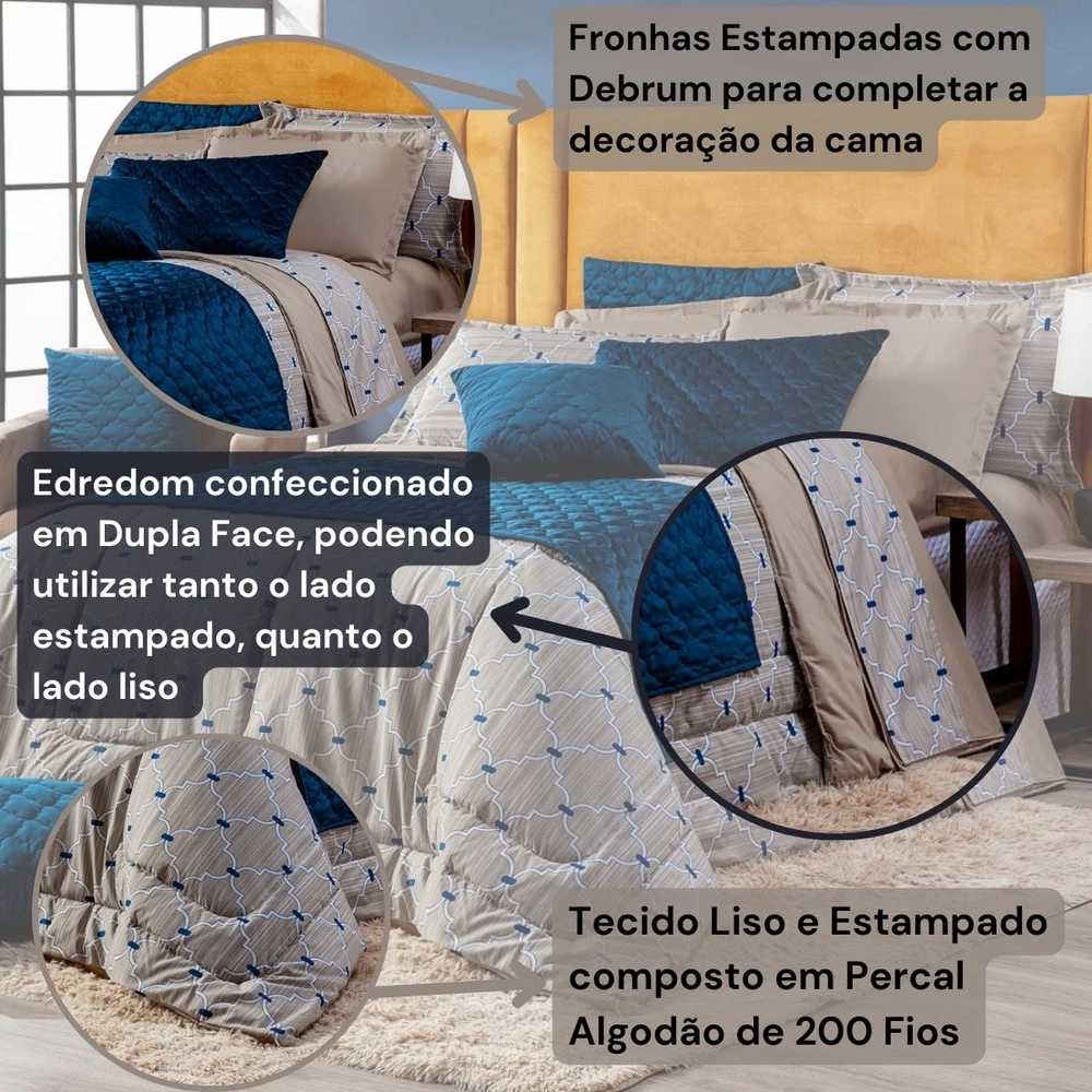 Nova Coleção Veneza, o Kit perfeito, coordenando cores e estampas que foram desenvolvidas especialmente para deixar o quarto ainda mais elegante. Dupla face você terá dois edredons em um só, podendo utilizar os dois lados! Esses edredons são fabricados em tecido Percal 200 fios de altíssima qualidade, perfeito para uma boa noite de sono, trazendo mais resistência, conforto e praticidade na hora de lavar. Além do belíssimo Edredom, o Kit acompanha um par de porta-travesseiros da mesma estampa, combinando tudo para sua decoração e também para presentear quem você ama! Confira!