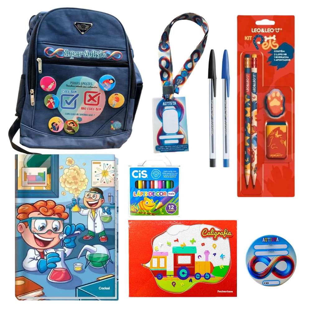Organização, inclusão e estilo reunidos em um só produto! O Kit Escolar com Mochila Super Autista foi desenvolvido para oferecer praticidade e acolhimento no ambiente escolar. Completo e funcional, ele reúne materiais de qualidade para o aprendizado, a criatividade e a expressão individual, além de itens especiais de identificação e conscientização sobre o autismo.