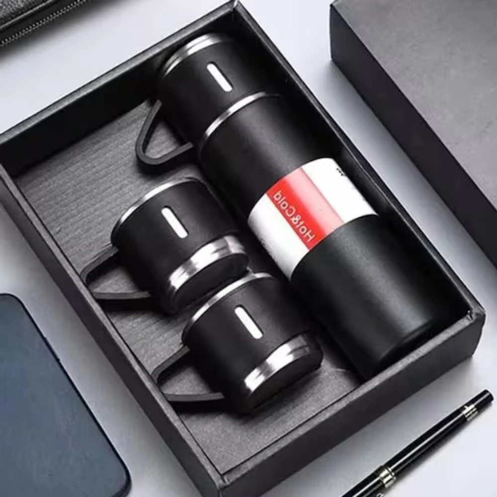 Kit Garrafa Térmica 500ml + 2 Xícaras – Inox com Isolamento a Vácuo Ideal para viagens, escritório ou uso diário, o kit inclui 1 garrafa térmica de inox (500ml) com tampa que vira xícara (100ml) e mais 2 xícaras extras de 100ml cada. Tampa com vedação segura e base antiderrapante. Sistema de abertura por botão, prático e higiênico.