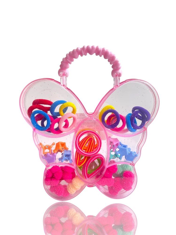Com diversas cores e formatos divertidos, o kit acompanha elásticos, presilhas, liguinhas e acessórios em um estojo em formato de coração borboleta ou flor, super delicado e fácil de transportar.