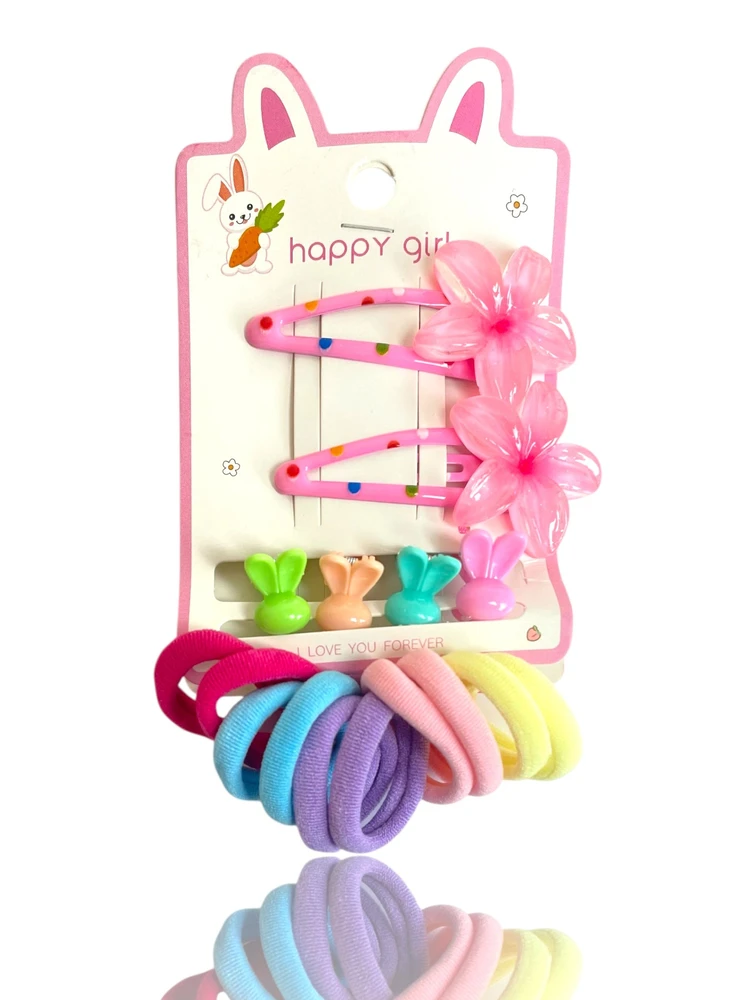 Cada conjunto vem com presilhas florais e mini piranhas coloridas, além de elásticos em tons candy, garantindo penteados lindos, alegres e confortáveis para o dia a dia.