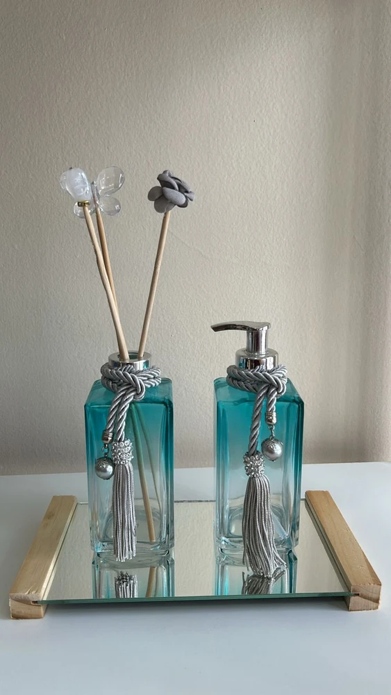 Esse Kit Lavabo deixará o ambiente da sua casa ou negócio muito mais requintando. Você ficará apaixonado pela delicadeza do conjunto. Além de tudo isso, ele é perfeito para presentar amigos e familiares. Irão adorar !CARACTERÍSTICAS:- 02 Frascos de Vidro Retangular Degrade- 01 Válvula Saboneteira Super Luxo- 01 Tampa para Difusor Luxo R.28m- 01 Bandeja espelhada - 05 Varetas de Fibra- 02 Pingente Decorativo