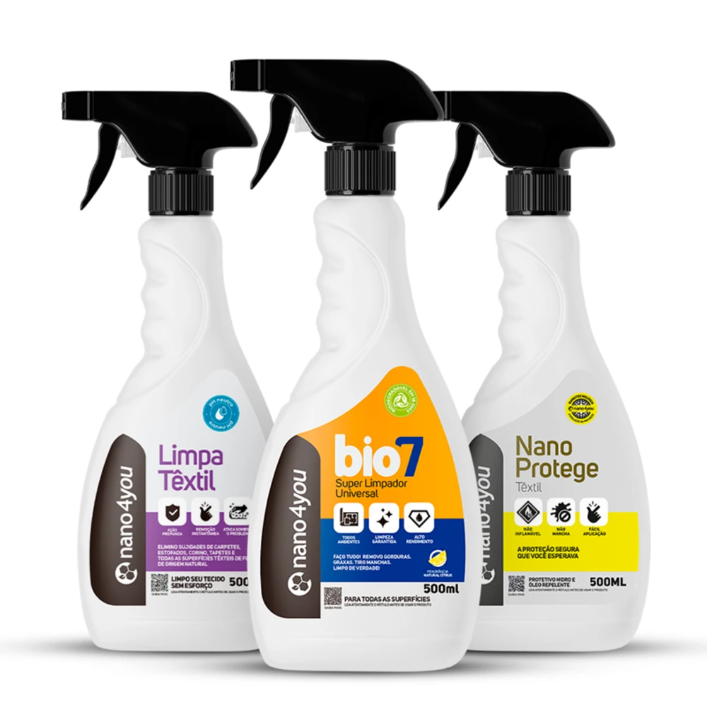 Composto por três soluções complementares — Limpa Têxtil, Bio7 Super Limpador Universal e Nano Protege Têxtil — o kit remove sujeiras e odores, trata manchas e ainda forma uma barreira invisível de proteção contra novas sujidades, líquidos e gordura. Tudo isso sem alterar o toque ou a aparência do tecido.
