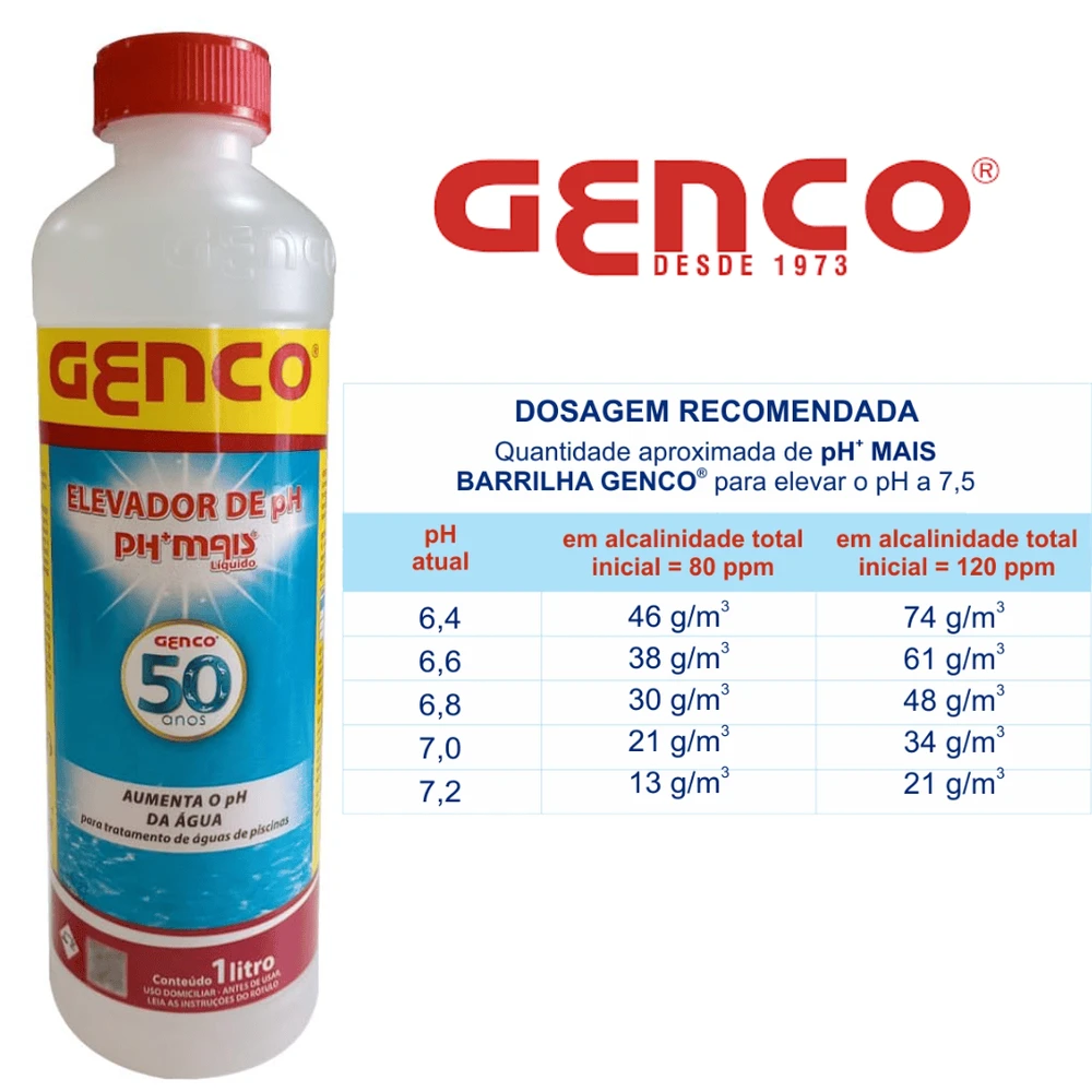 GENCO PH MAIS - O pH é uma medida que indica se a água está ácida (pH Baixo), neutra ou alcalina (pH alto). O pH correto assegura conforto aos banhistas, proteção dos equipamentos e eficácia sanitizante do cloro. Alcalinidade Total é a medida da capacidade da água em resistir a variações do pH. Se a Alcalinidade Total estiver acima de 120 ppm, poderá haver dificuldade no ajuste do pH.