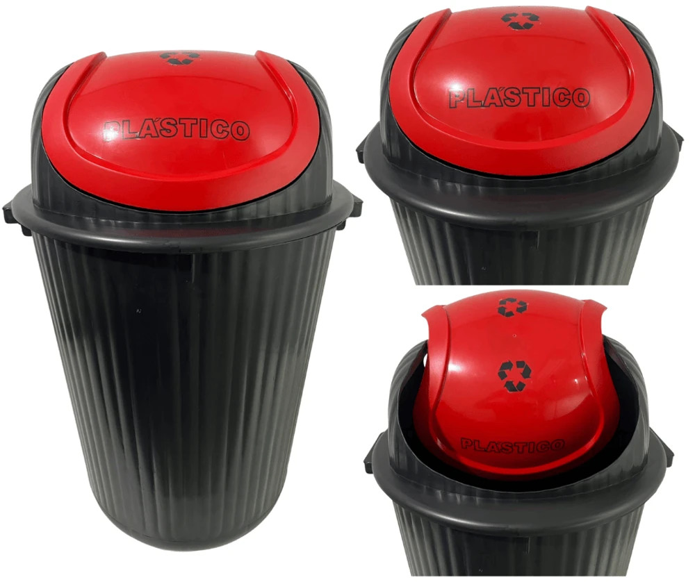 - Lixeira para coleta seletiva de produtos de plástico, cor vermelha.