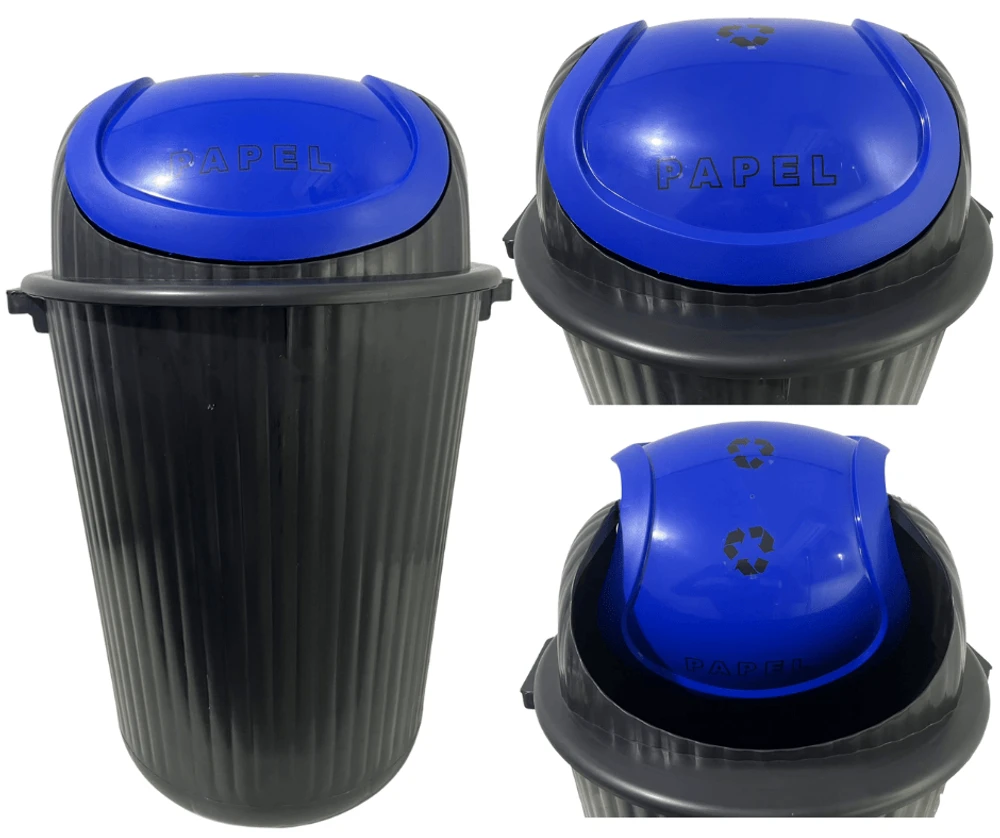 - Lixeira para coleta seletiva de produtos de papel, cor azul.