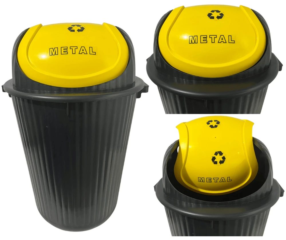 - Lixeira para coleta seletiva de produtos de metal, cor amarela.