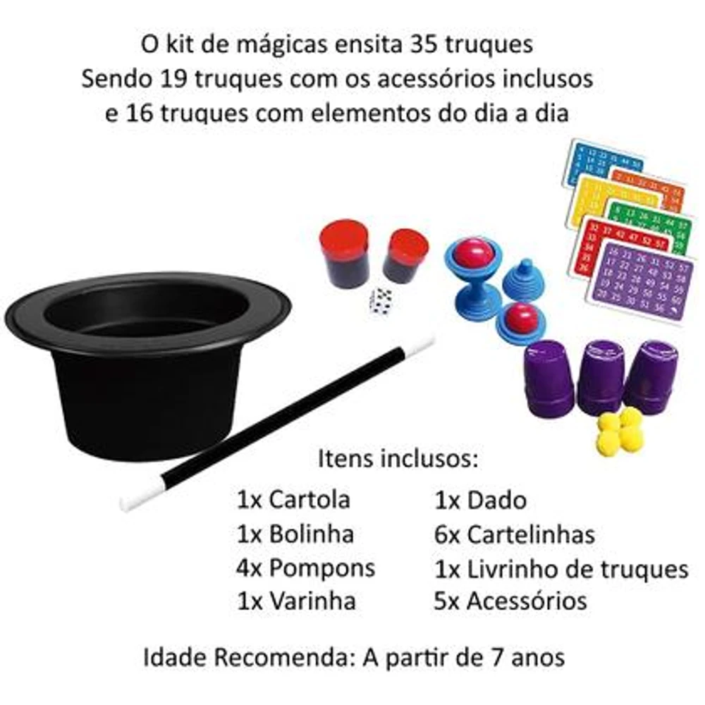 Informações Importantes: Brinquedo recomendado para crianças a partir de 7 anos, alguns truques pode precisar do auxílio de adultos para ser interpretado e executado a partir do livro, nem todos os truques incluídos no livro acompanha os acessórios na maleta, pode ser necessário adquirir itens a parte para executar alguns truques.