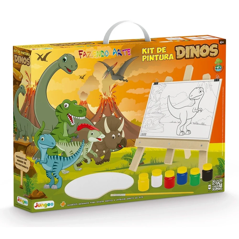 O Kit Pintura Dinos da Junges é ideal para os pequenos explorarem sua criatividade de forma divertida e educativa. Com cavalete em madeira de reflorestamento (MDF) e base para fixar os desenhos, o kit oferece estabilidade e praticidade durante a pintura. Inclui desenhos de dinossauros, pincel, paleta para misturar cores e guaches vibrantes, permitindo que as crianças desenvolvam habilidades motoras, coordenação e percepção de cores enquanto dão vida aos seus próprios personagens pré-históricos.
