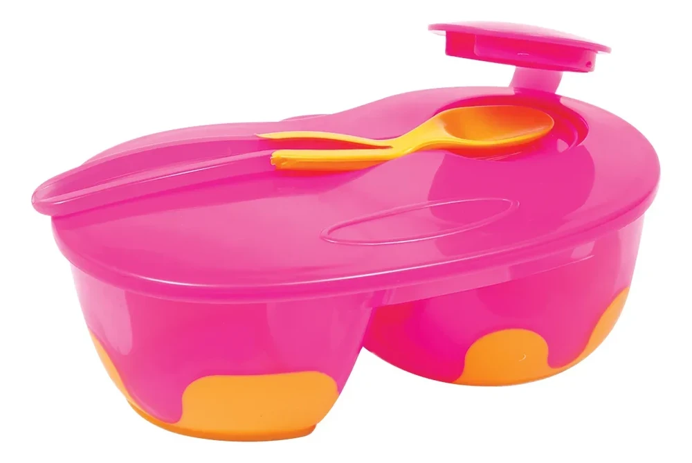 Contém: 1 prato com divisórias, 1 colher e 1 garfo