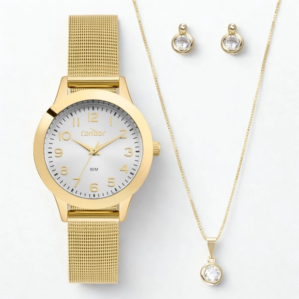 A Coleção Kit Dia a Dia da Condor é o Par Perfeito para te acompanhar. Com pulseira em aço inoxidável mesh, seu mostrador está disponível em prata, com resistência à água de 50m e banho dourado. Destaque para o conjunto de semijoias encantadoras, garantindo uma combinação perfeita em todos os momentos.