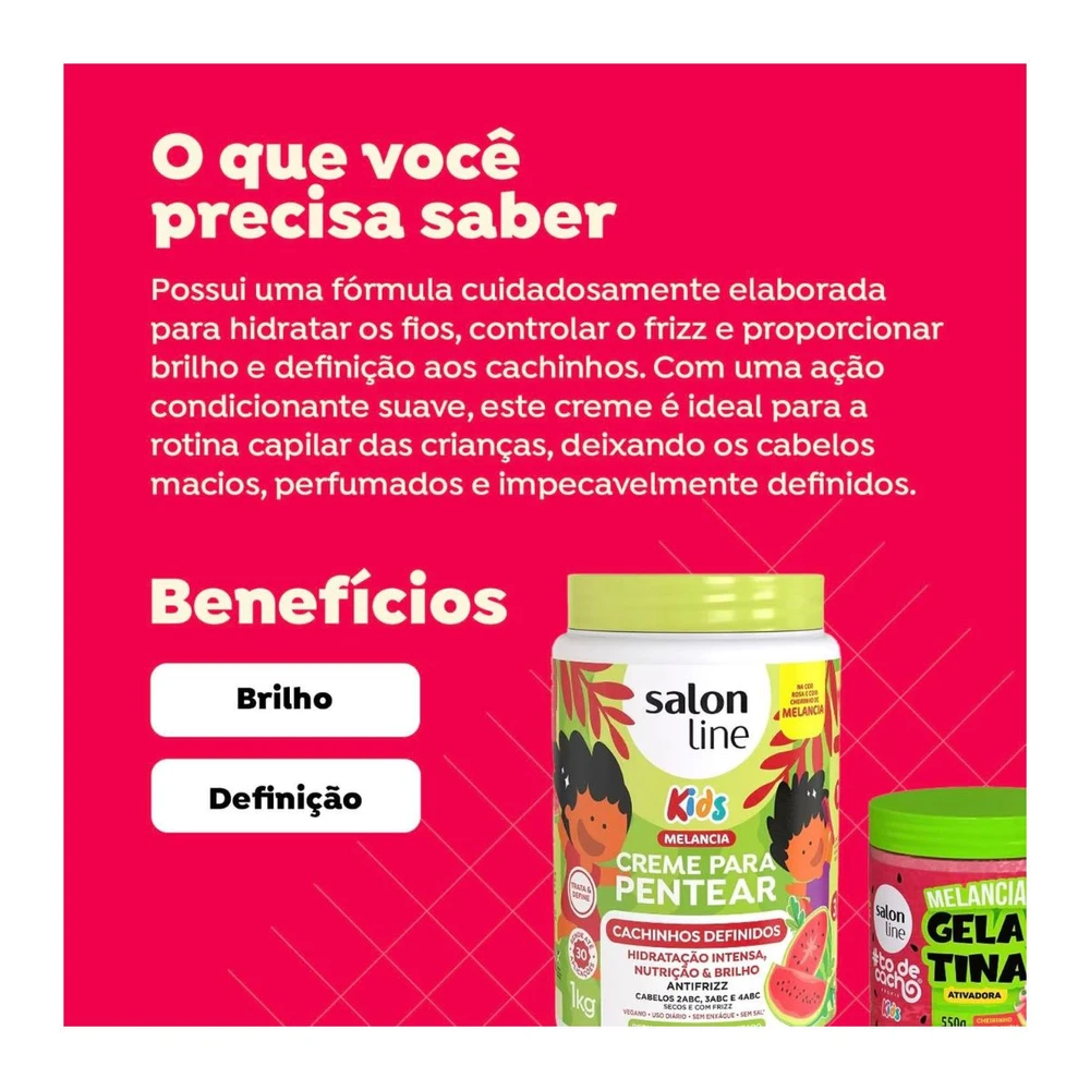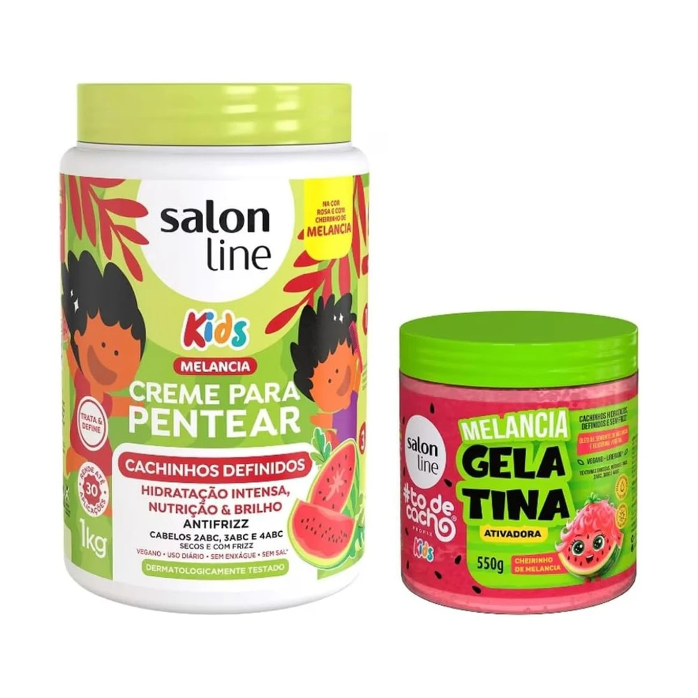 O Kit Salon Line #TôDeCacho Kids Melancia Creme para Pentear 1kg + Gelatina 550g foi criado para cuidar com amor e diversão dos cabelos cacheados e crespos das crianças, garantindo hidratação, maciez, definição e brilho natural.
