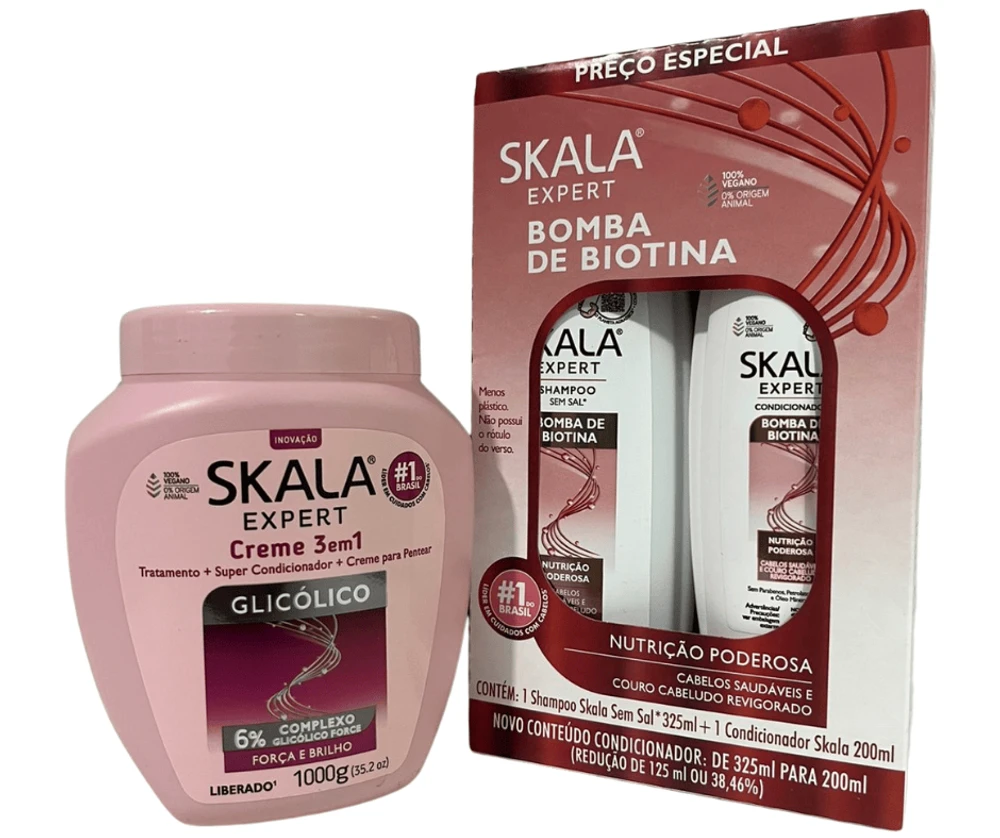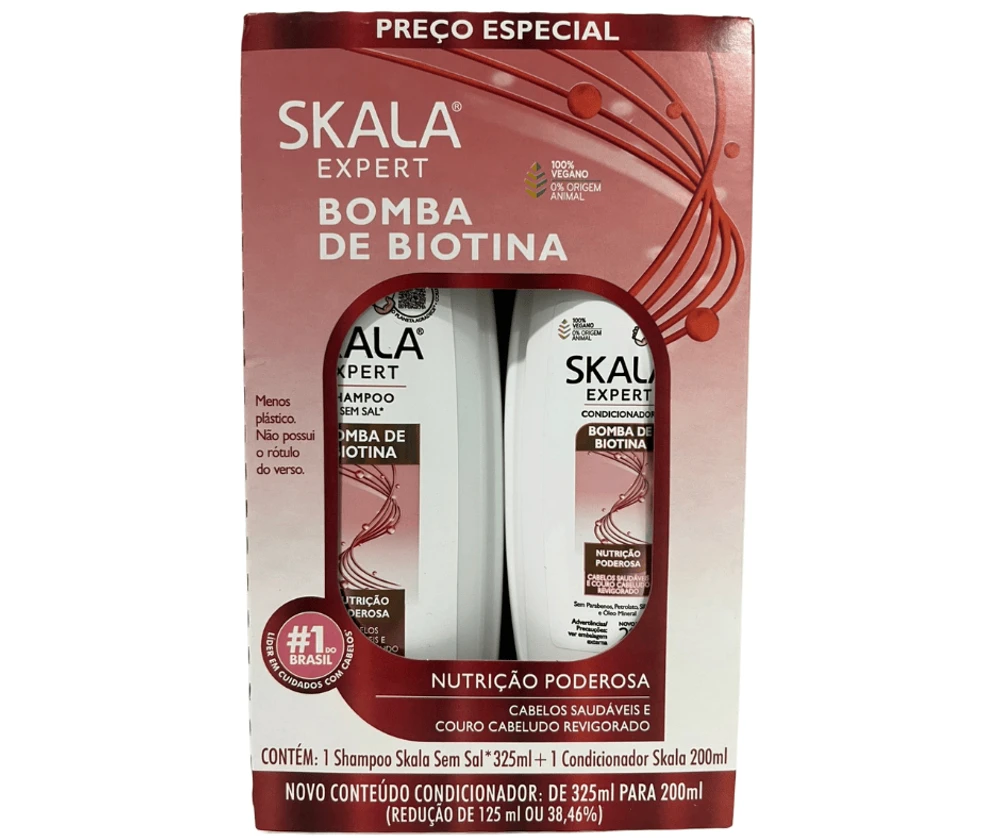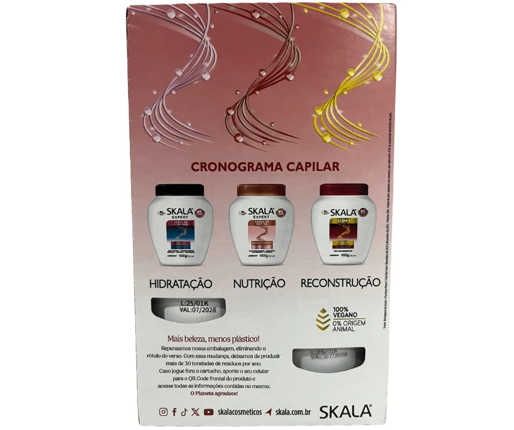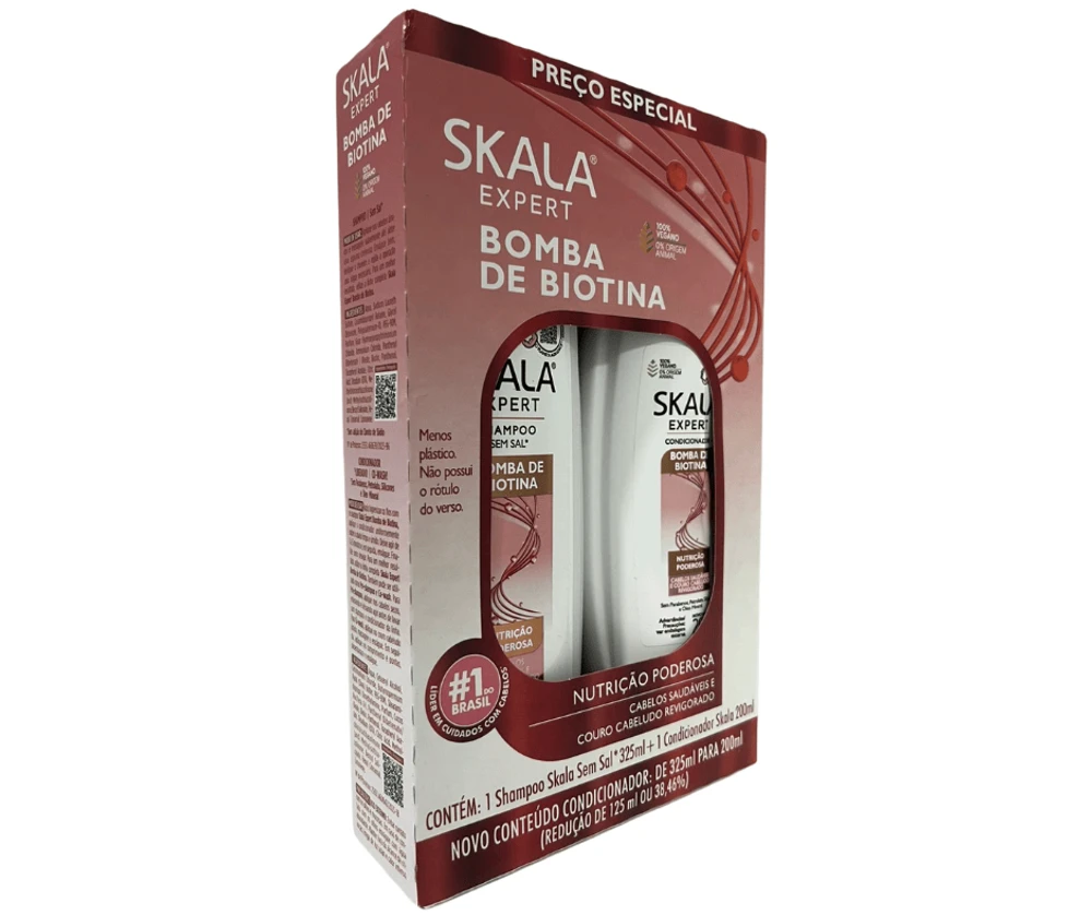 Etapa do Cronograma: a família Bomba de Biotina Skala Expert se enquadra nas fases de Nutrição e Reconstrução, uma linha Nutri Reconstrutora. Nutrição: para fios ressecados com pontas secas. Essa etapa devolve os lipídios, dando movimento e alinhamento aos fios. Reconstrução: para fios fragilizados, danificados, emborrachados quebradiços devido a química.