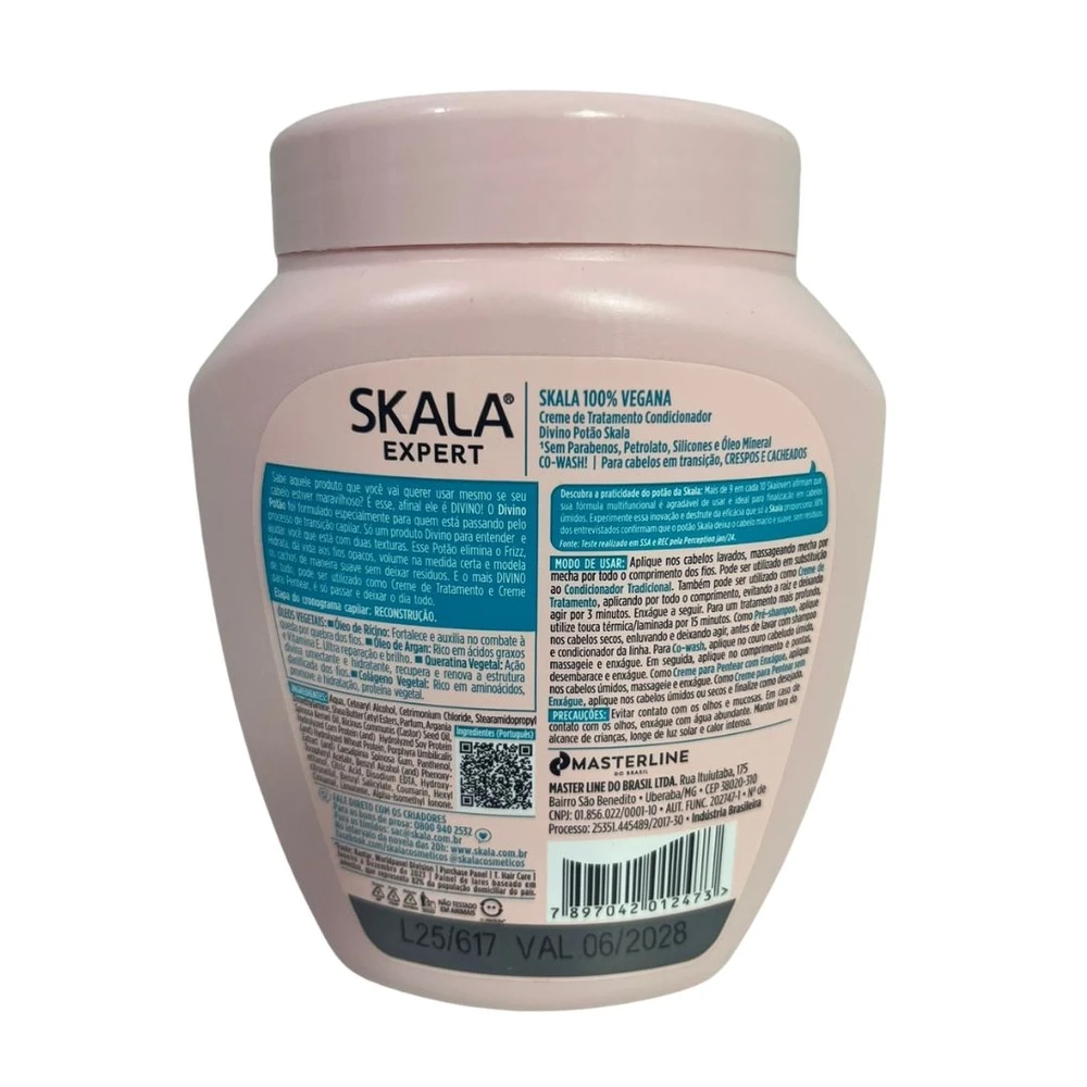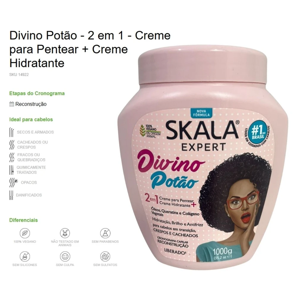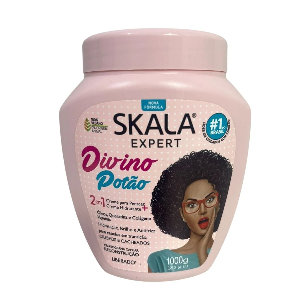 Sabe aquele produto que você vai querer usar mesmo se seu cabelo estiver maravilhoso? É esse, afinal ele é DIVINO! O Divino Potão foi formulado especialmente para quem está passando pelo processo de Transição Capilar. Só um produto Divino para entender e ajudar você que está com duas texturas. Esse Potão elimina o Frizz, Hidrata, dá vida aos fios opacos, volume na medida certa e modela os cachos de maneira suave sem deixar resíduos. E o mais DIVINO de tudo, pode ser utilizado como Creme de Tratamento e Creme para Pentear, é só passar e deixar o dia todo. Sua fórmula é livre de Sulfatos, Parabenos, Silicones, Petrolato e Óleo Mineral. #SkalaApaixonadaPorAnimais é *Vegano: não possui ingredientes de origem animal. Não é um máximo esse conceito de INOVAÇÃO da Skala? Desenvolvido especialmente para você que ama os animais e a técnica do liberado!