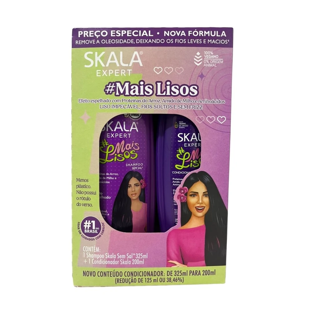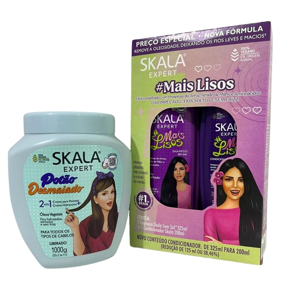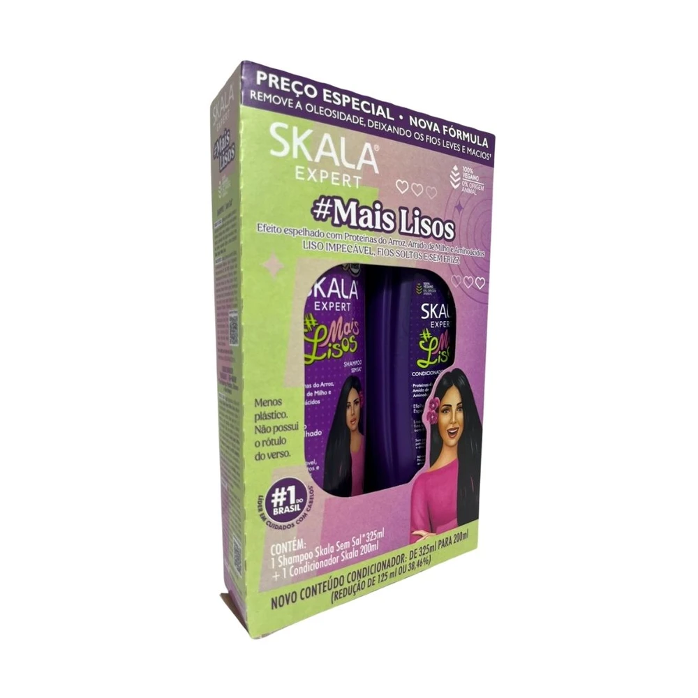 A linha Skala #MaisLisos possui em sua fórmula ativos poderosos que dão o famoso efeito desmaiado. Fios soltos, lisos e sem frizz. Enriquecida com vitamina E e D'Panthenol, possui Proteínas do Arroz, Amido de Milho e Aminoácidos que formam uma película protetora ao redor dos fios, deixando-os com menos volume e extremamente alinhados.