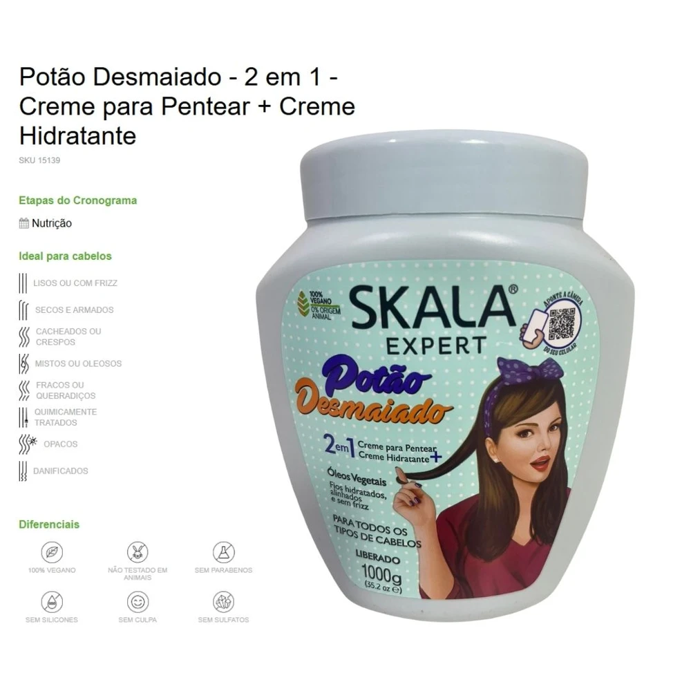 É esse! O Potão Desmaiado foi formulado especialmente para você que busca resultados imediatos. Esse Potão elimina o frizz, dá vida aos fios opacos, hidrata profundamente, reduz o volume e deixa seus fios alinhados. E o mais INCRIVÉL de tudo está por vir, só não vale desmaiar depois dessa novidade pode ser utilizado como Creme de Tratamento e Creme para Pentear. É só passar e deixar o dia todo! Sua fórmula é livre de Sulfatos, Parabenos, Silicones, Petrolato e Óleo Mineral. #SkalaApaixonadaPorAnimais é *Vegano: não possui ingredientes de origem animal. Não é um máximo esse conceito de INOVAÇÃO da Skala? Desenvolvido especialmente para você que ama os animais e a técnica do liberado!