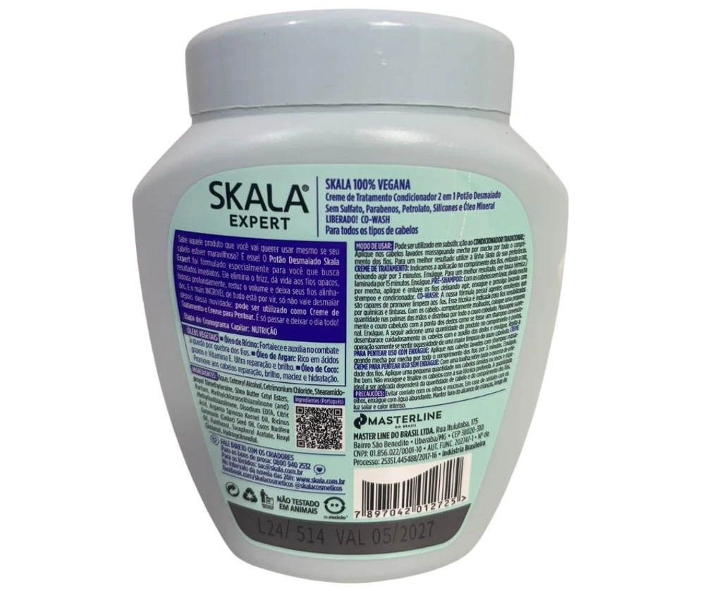 MODO DE USAR: Após higienizar os fios com o Shampoo #MaisLisos, aplique o Condicionador uniformemente sobre o cabelo limpo e úmido. Deixe agir de 1 a 3 minutos e, em seguida, enxágue. Finalize como desejar. Para um melhor resultado utilize a linha completa #MaisLisos Skala Expert. Escolha um dos rituais de uso: caso o fio esteja ressecado, use como PRÉ SHAMPOO. Com os cabelos sem lavar, divida mecha por mecha, aplique e enluve os fios deixando agir. Enxágue e prossiga lavando com shampoo e condicionador. CO WASH: A nossa fórmula possui agentes emolientes que são capazes de promover limpeza aos fios. Indicado para fios sensibilizados por químicas e tinturas. Com os cabelos completamente molhados, coloque uma pequena quantidade nas palmas das mãos e distribua por todo o couro cabeludo. Massageie suavemente o couro cabeludo com a ponta dos dedos como se fosse um shampoo convencional. Enxágue. A seguir, adicione uma quantidade do produto no comprimento e pontas, desembarace cuidadosamente os cabelos com o auxílio dos dedos e enxágue bem. Repita a operação somente se sentir necessidade de uma maior limpeza do couro cabeludo.