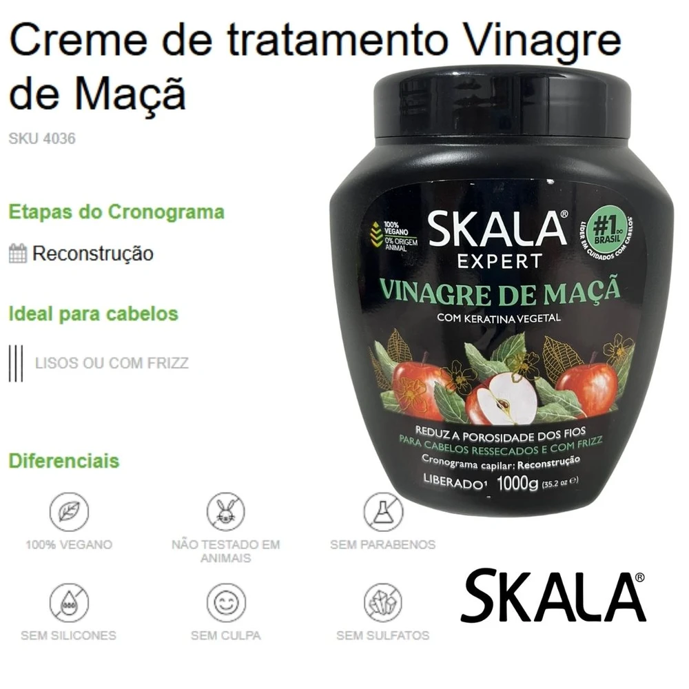 A linha Skala Vinagre de Maçã veio para acabar com os fios ressecados e com frizz. Essa linha reduz a porosidade, proporciona brilho extremo e fios saudáveis. Enriquecida com Vinagre de Maçã associado à vitamina E, D’Panthenol e Keratina Vegetal, proporciona uma reconstrução perfeita, selando as cutículas, restaurando e devolvendo maciez e beleza aos fios.