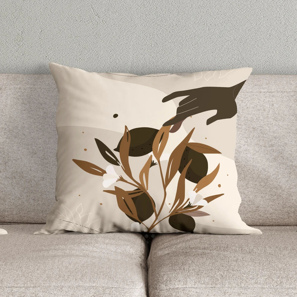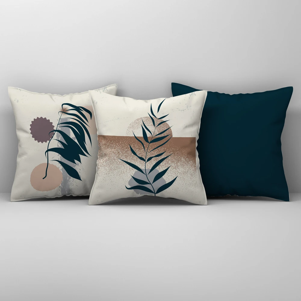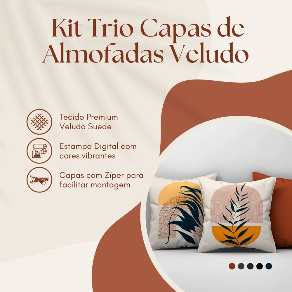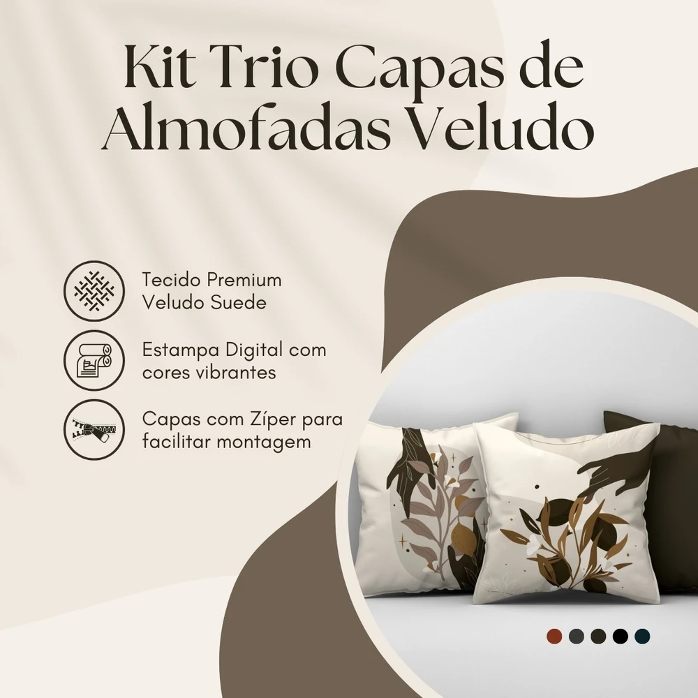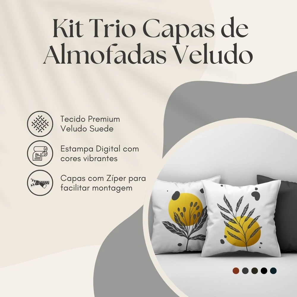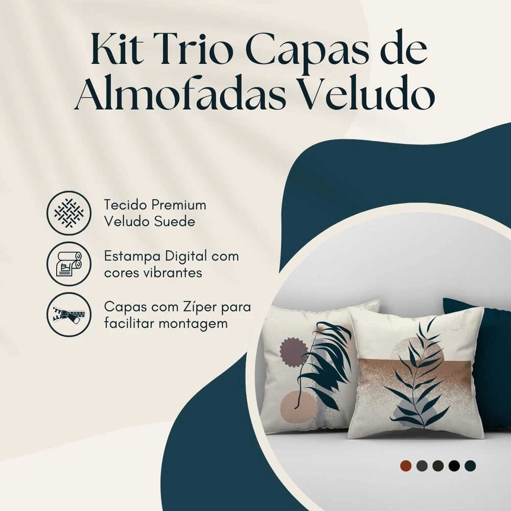 Kit Trio Capas de Almofadas Estampadas Folhas em Veludo Suede 45cm x 45cm - Decoração para Sala