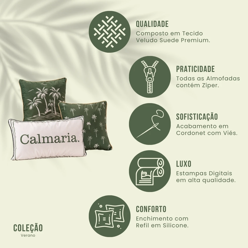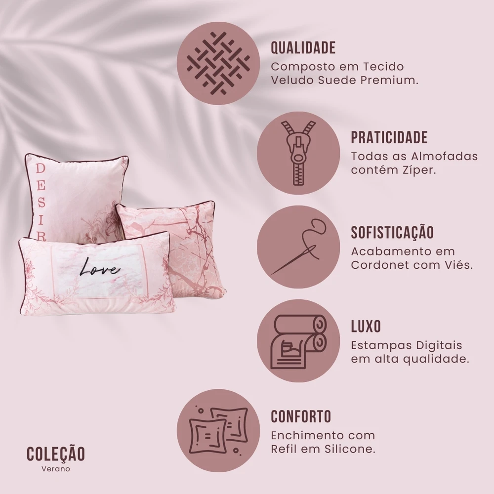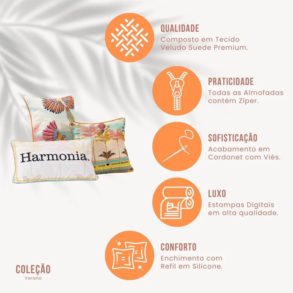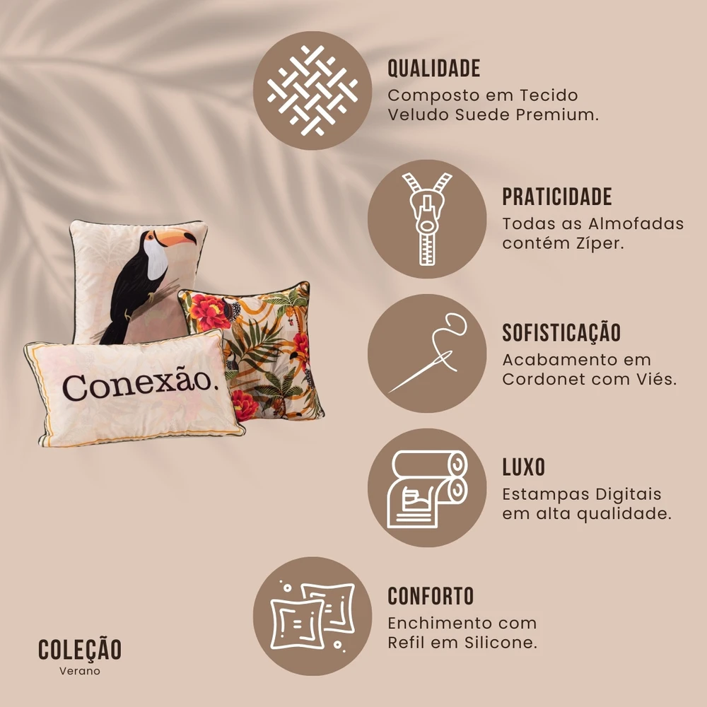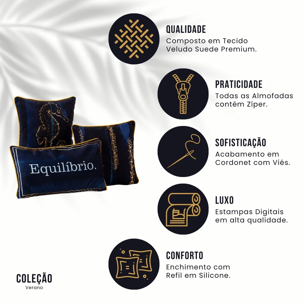 Transforme seu ambiente com a Coleção de Almofadas Verano, um conjunto sofisticado e perfeito para quem busca elegância e conforto. Produzidas em tecido veludo suede de alta qualidade, essas almofadas possuem estampas exclusivas que trazem toda a leveza e frescor do verão para a sua decoração, além de trazer lindas palavras escritas com o significado que cada elemento possui. Com o acabamento diferenciado em toda a volta em cordonet com viés. O enchimento em refil silicone garante uma maciez incomparável e durabilidade, mantendo a forma por mais tempo. Ideal para adicionar um toque de luxo e sofisticação aos sofás, camas ou poltronas, o Kit de Almofadas Verano é a escolha perfeita para quem deseja transformar o ambiente com estilo e praticidade. Além de serem super aconchegantes, elas são versáteis e combinam facilmente com diversos estilos de decoração, seja para uma casa de praia ou um ambiente mais urbano. Renove sua decoração e viva o verão o ano inteiro com essas almofadas cheias de estilo! Confira!