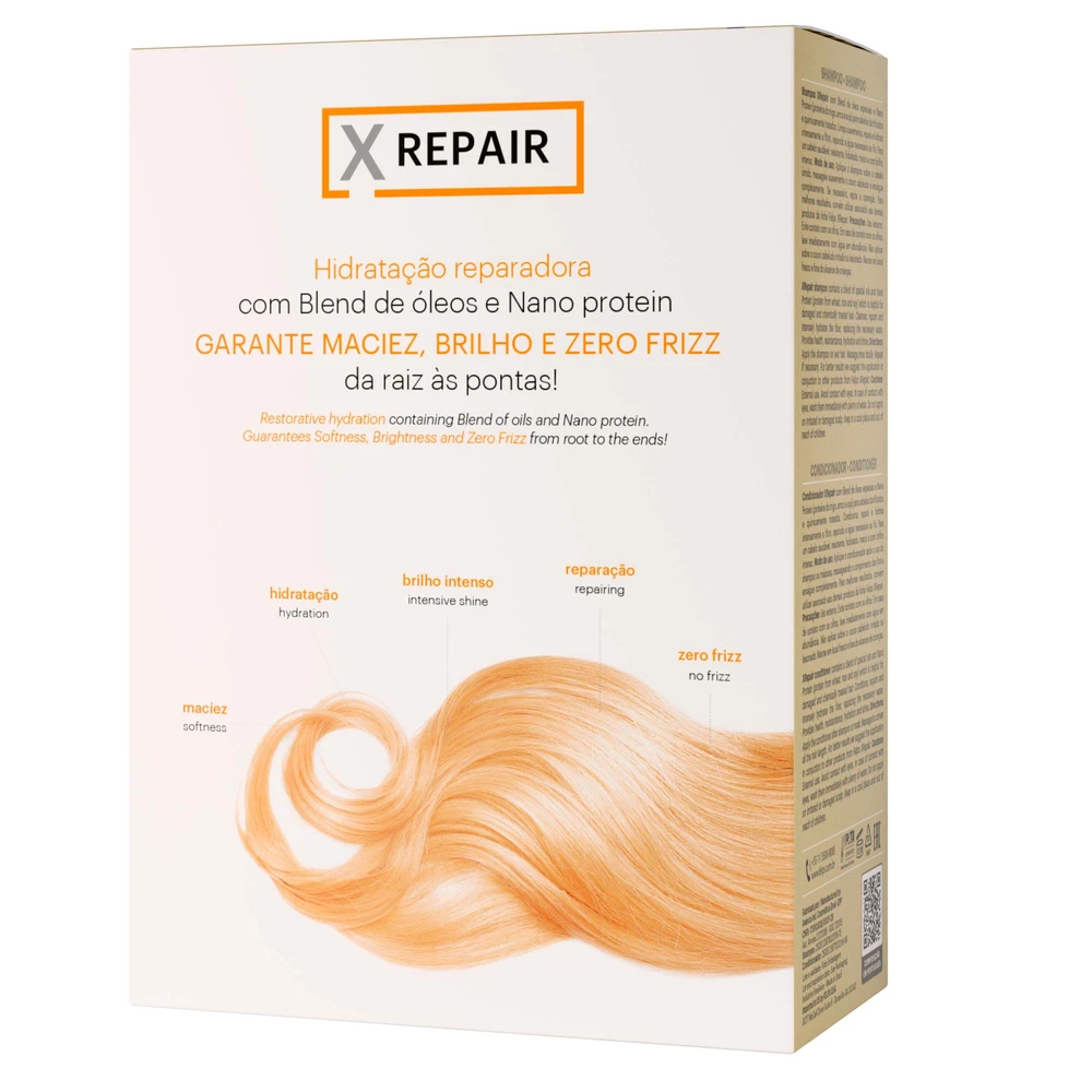 Shampoo XRepair com Blend de óleos especiais e Nano Protein (proteína do trigo, arroz e soja) para cabelos danificados e quimicamente tratados. Limpa suavemente, repara e hidrata intensamente a fibra, repondo a água necessária ao fio. Para um cabelo saudável, resistente, hidratado, macio e com brilho intenso. Condicionador XRepair com Blend de óleos especiais e Nano Protein (proteína do trigo, arroz e soja) para cabelos danificados e quimicamente tratados. Condiciona, repara e hidrata intensamente a fibra, repondo a água necessária ao fio. Para um cabelo saudável, resistente, hidratado, macio e com brilho intenso.
