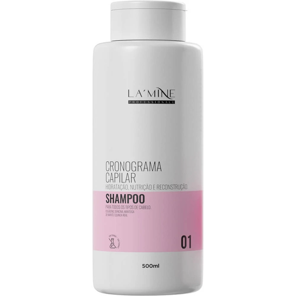 Shampoo Cronograma Capilar La' Mine foi desenvolvido para todos os tipos de cabelo, devido à combinação de ativos multifuncionais, em proporções iguais que promove hidratação, nutrição e reconstrução ao mesmo tempo em que realinha os fios. Retira o frizz sem pesar o cabelo e combate no envelhecimento precoce da fibra capilar.