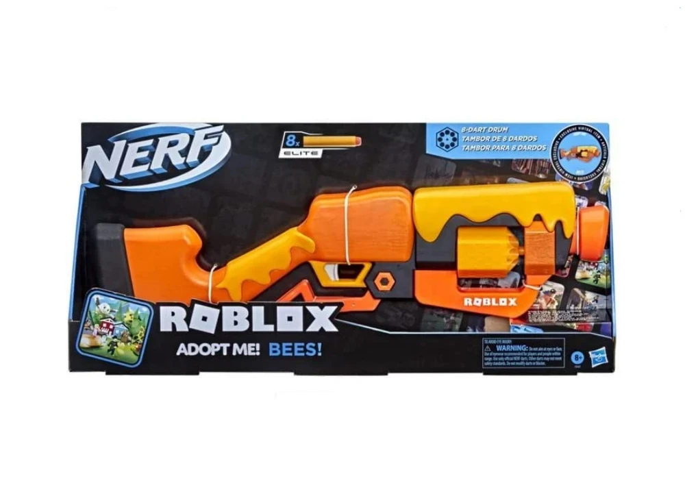 Lançador de dardos inspirado no jogo Roblox Adopt Me! O lançador inclui um código que permite resgatar um item virtual exclusivo em Roblox. O lançador possui um tambor giratório de 8 dardos. Basta carregar o tambor, mover a alavanca carregadora e acionar a alavanca de disparo para lançar os dardos. Vem com 8 dardos Nerf Elite oficiais feitos de espuma. Os dardos de espuma oficiais Nerf Elite são testados e aprovados para desempenho e qualidade, ótimos para jogos em lugares fechados ou abertos. Óculos recomendados (não incluídos). Não requer pilhas.