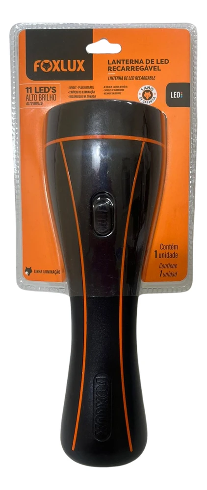 Características gerais:- Corpo: ABS;- Dimensão: 18cm;- Luz: branca;- Alimentação: recarregável;- Bivolt;- 2 níveis de intensidade;- Recarregáveis;- 11 Leds: duração de até 12h de luz;- Plugue retrátil hexagonal embutido na base;- Com chave seletora de funções: desligado, parcial, todos os leds;- Alumínio interno para maior luminosidade.EAN: 7898105779265Contém:- 1 LANTERNA RECARREGÁVEL ABS 11 LEDS BIVOLT FOXLUX.