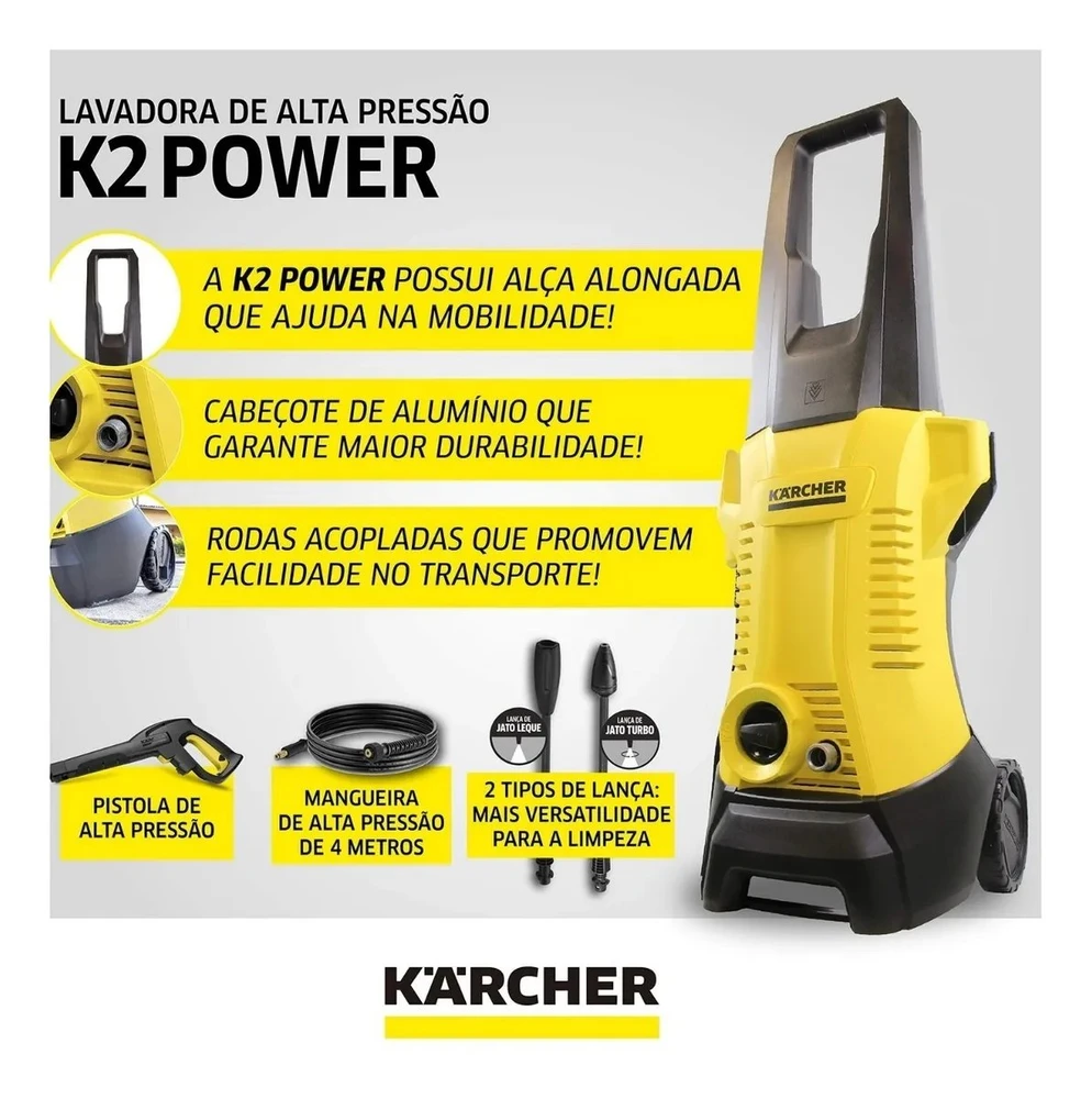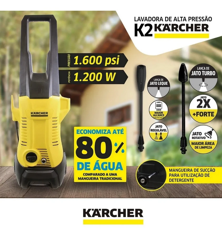 Lavadora de pressão Karcher K2 1400W 110 bar – compacta, potente e ideal para uso profissional com economia de água e alta durabilidade.